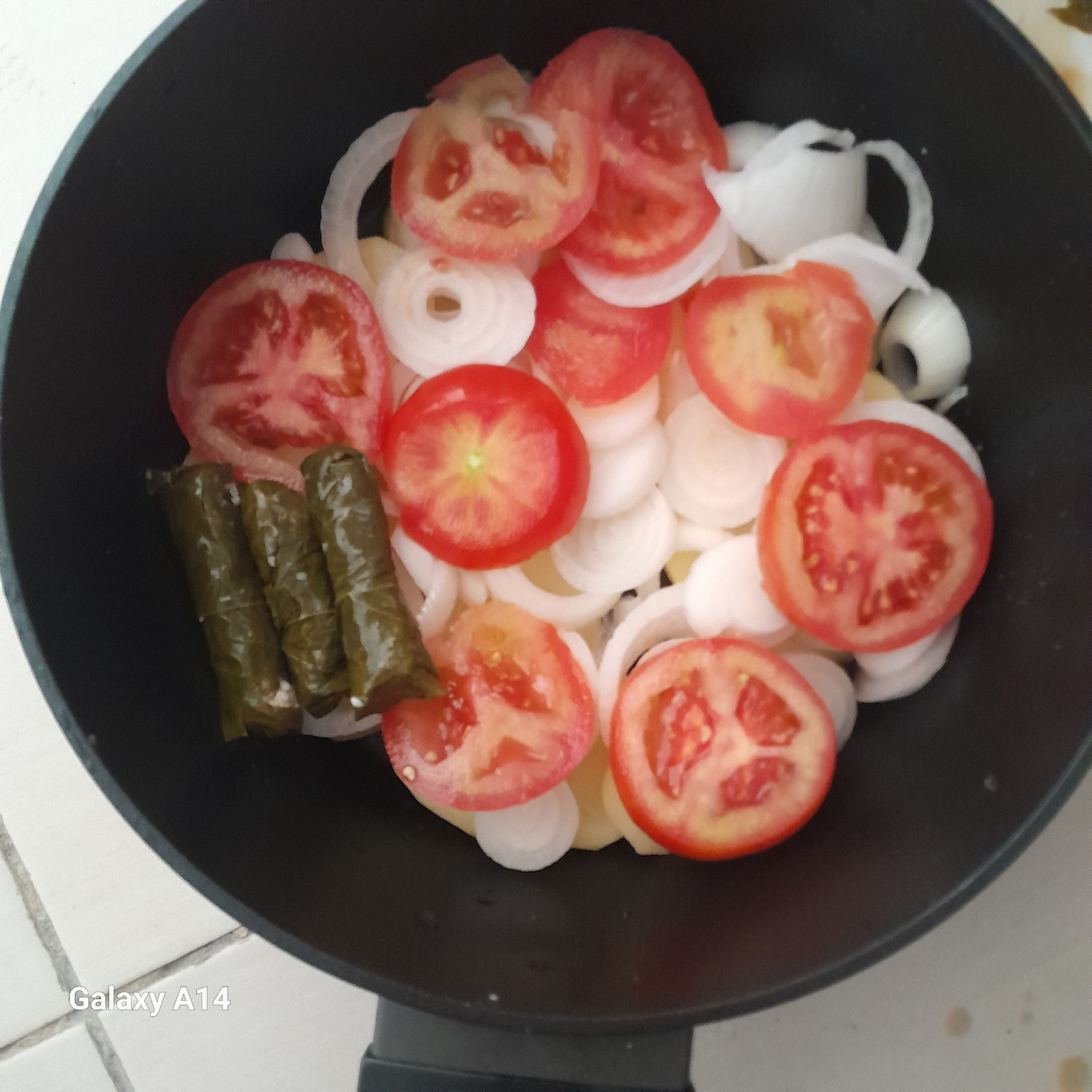 A top-down, medium shot reveals a black cooking pot filled with food. Sliced tomatoes and onions are interspersed throughout the pot, with what appears to be potato slices underneath. Additionally, se…read more