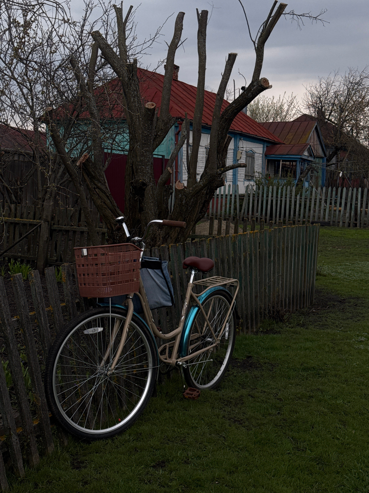The image presents a rural landscape, likely in the village of Semeno-Aleksandrovka, Russia, under an overcast sky. In the foreground and midground, a bicycle leans against an weathered wooden picket…read more