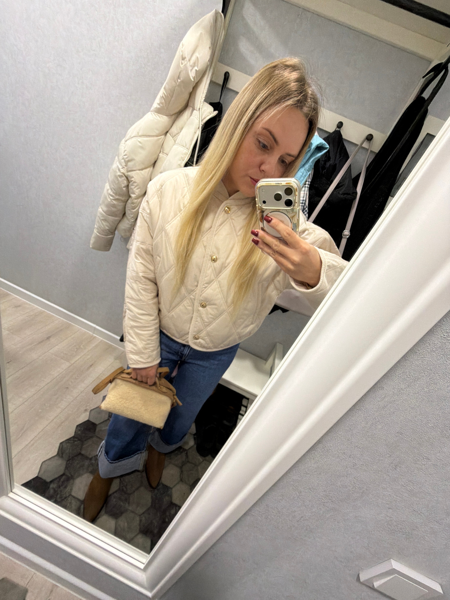 A woman stands indoors, taking a selfie in a mirror. The woman has long blonde hair and is wearing a cream-colored quilted jacket, blue jeans, and brown shoes. She is holding a smartphone with a gold…read more