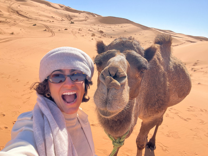 An adult female and a dromedary camel are captured in a selfie-style photograph taken in a desert environment near Rissani, Morocco. The female subject, positioned on the left, is wearing sunglasses,…read more