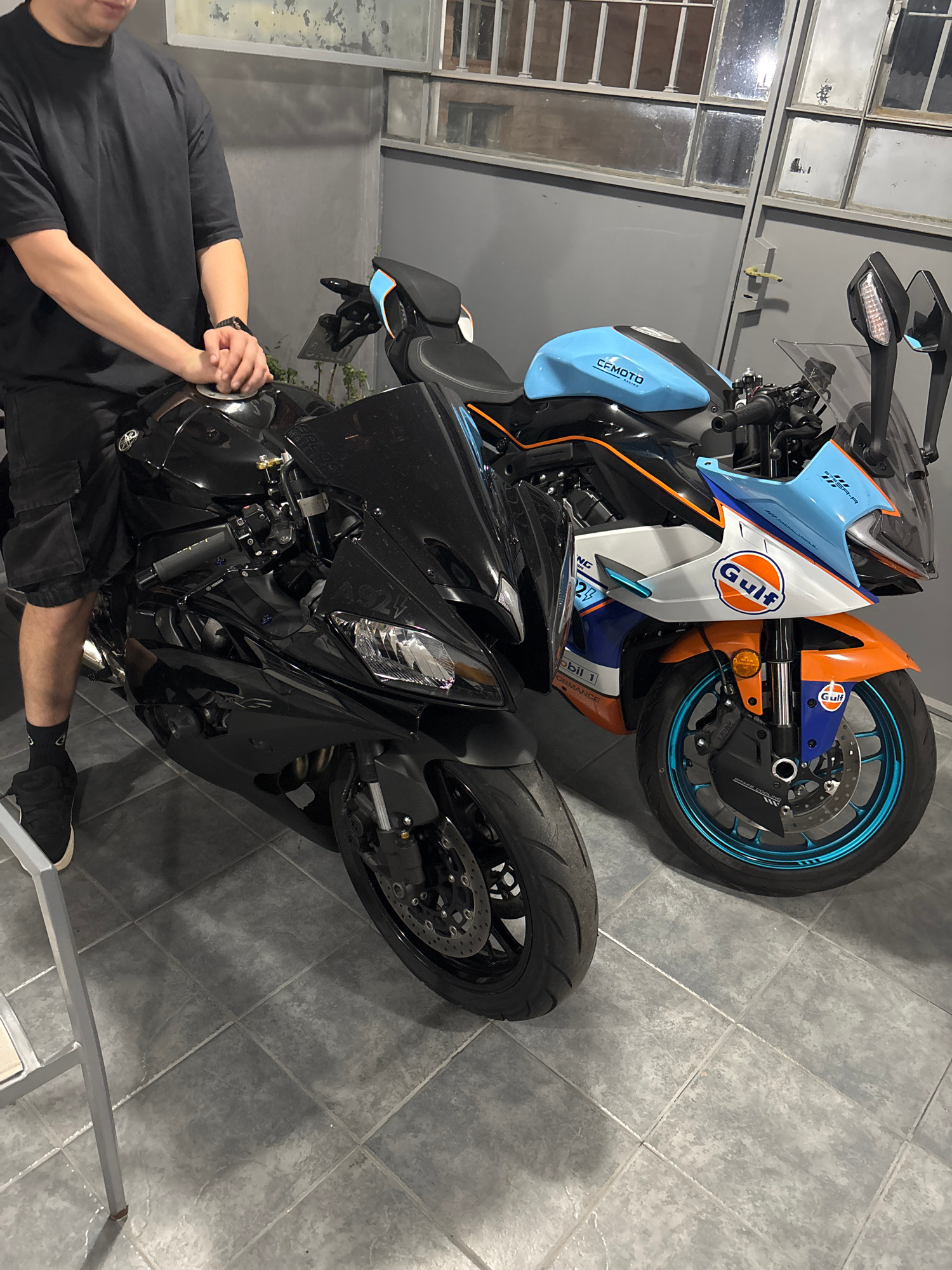 The image shows two motorcycles parked indoors. The one in the foreground is a black motorcycle with its front wheel facing the viewer. A person wearing a black t-shirt, black shorts, and black shoes…read more