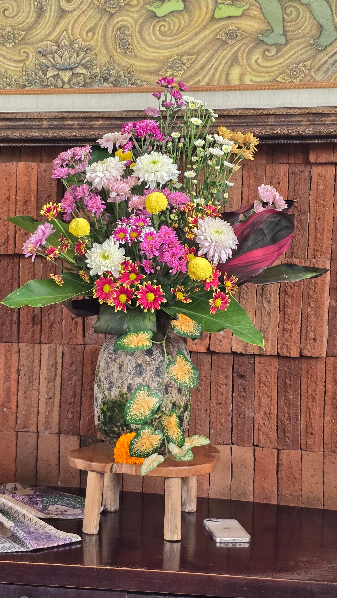 The image shows a vibrant floral arrangement in a rustic setting. Various flowers in shades of pink, white, yellow, and red are arranged together. Leaves, including a striking red and black leaf, add…read more
