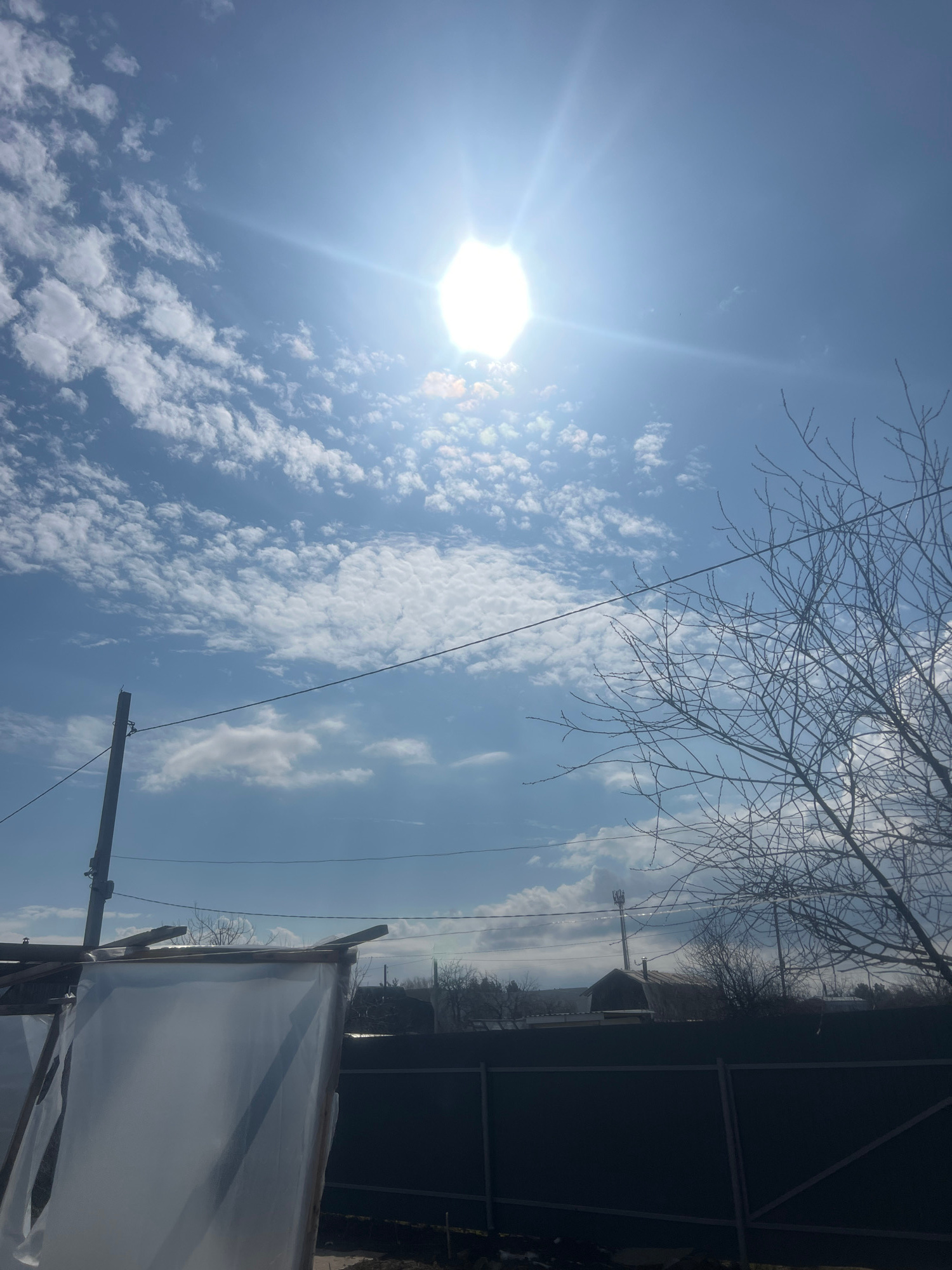 This image, taken in Chaikovsky, Russia, captures a bright outdoor scene dominated by a clear blue sky with scattered white cumulus and cirrocumulus clouds. The sun is a powerful, intensely bright ligβ¦read more