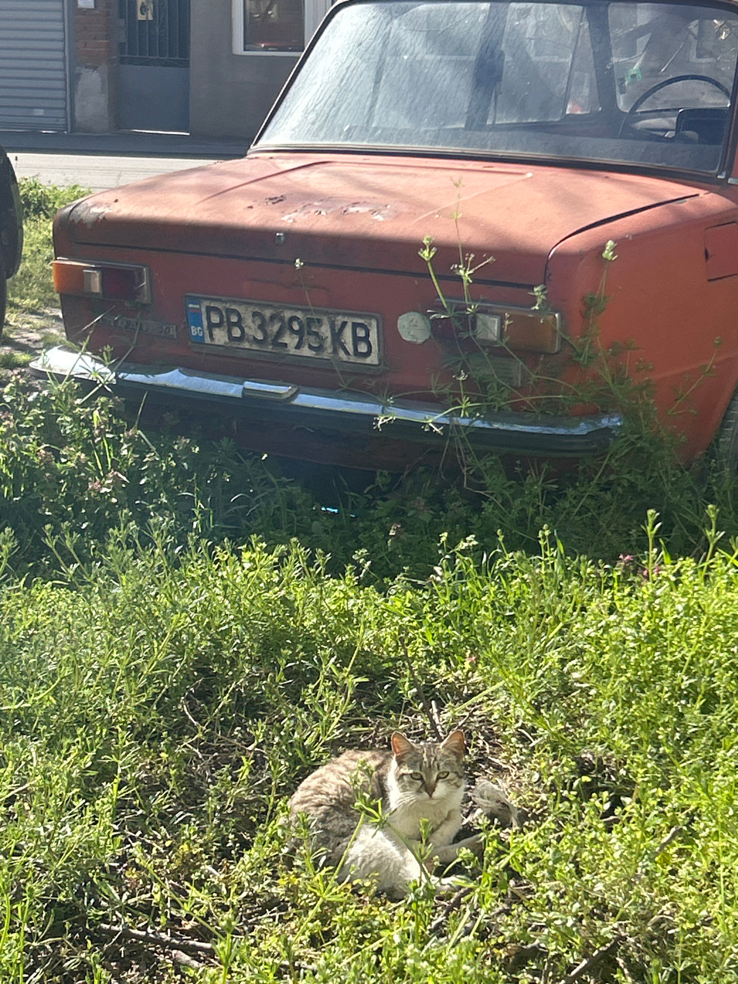 The image shows a portion of a red, possibly abandoned car with license plate "PB 3295 KB" (Bulgarian registration) partially obscured by overgrown vegetation. The location is likely Plovdiv, Bulgaria…read more