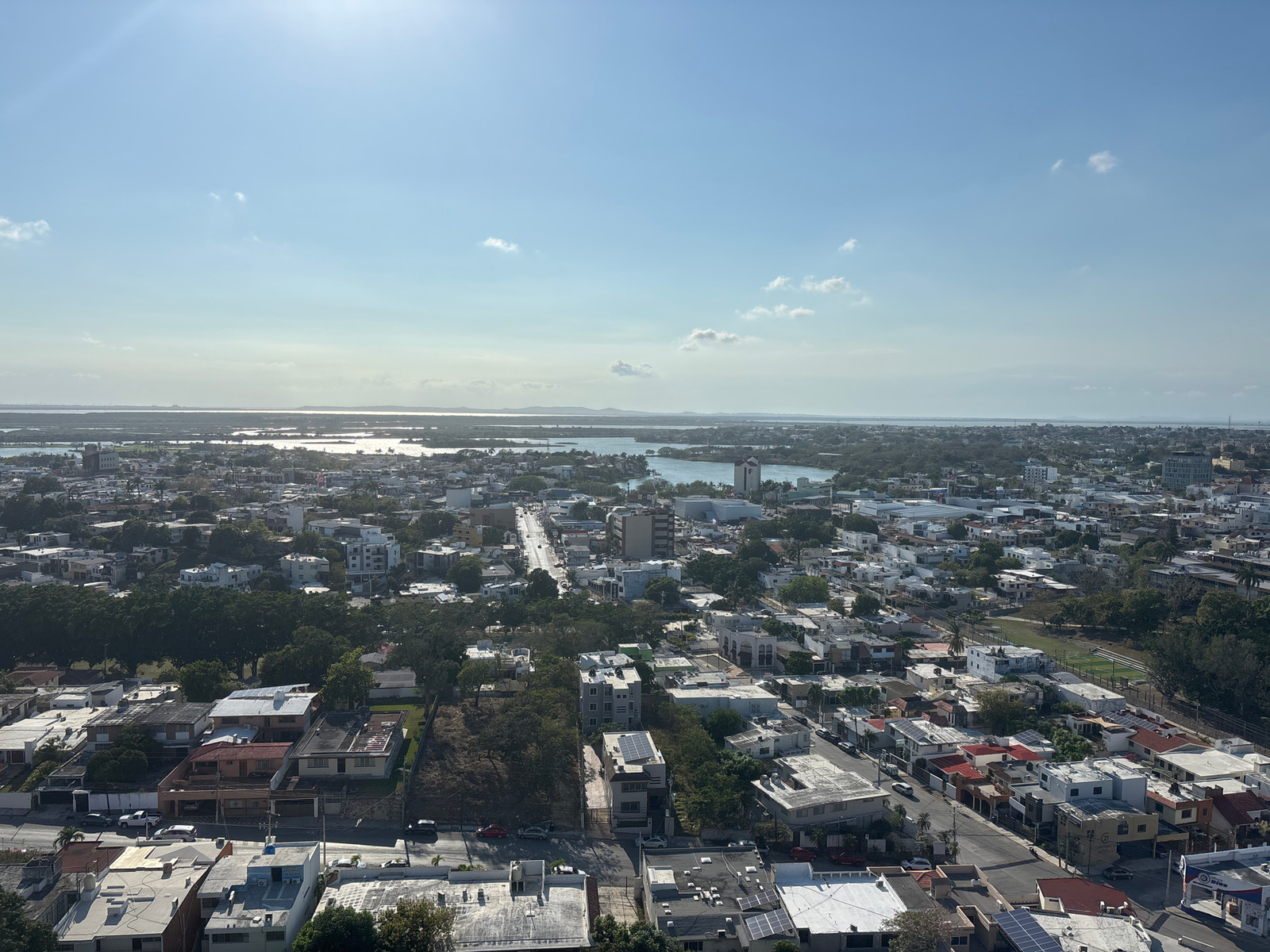 The image shows an elevated, panoramic view of Tampico, Mexico, looking towards the horizon over the Laguna del Carpintero. The city is densely packed with buildings, primarily residential, interspers…read more