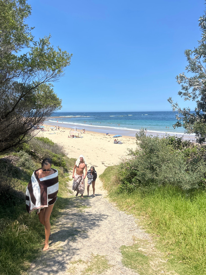 A beach scene captured on a bright, sunny day. People are seen walking down a sandy path towards the beach. Some are in swimwear or wrapped in towels. The beach itself is populated with people swimmin…read more