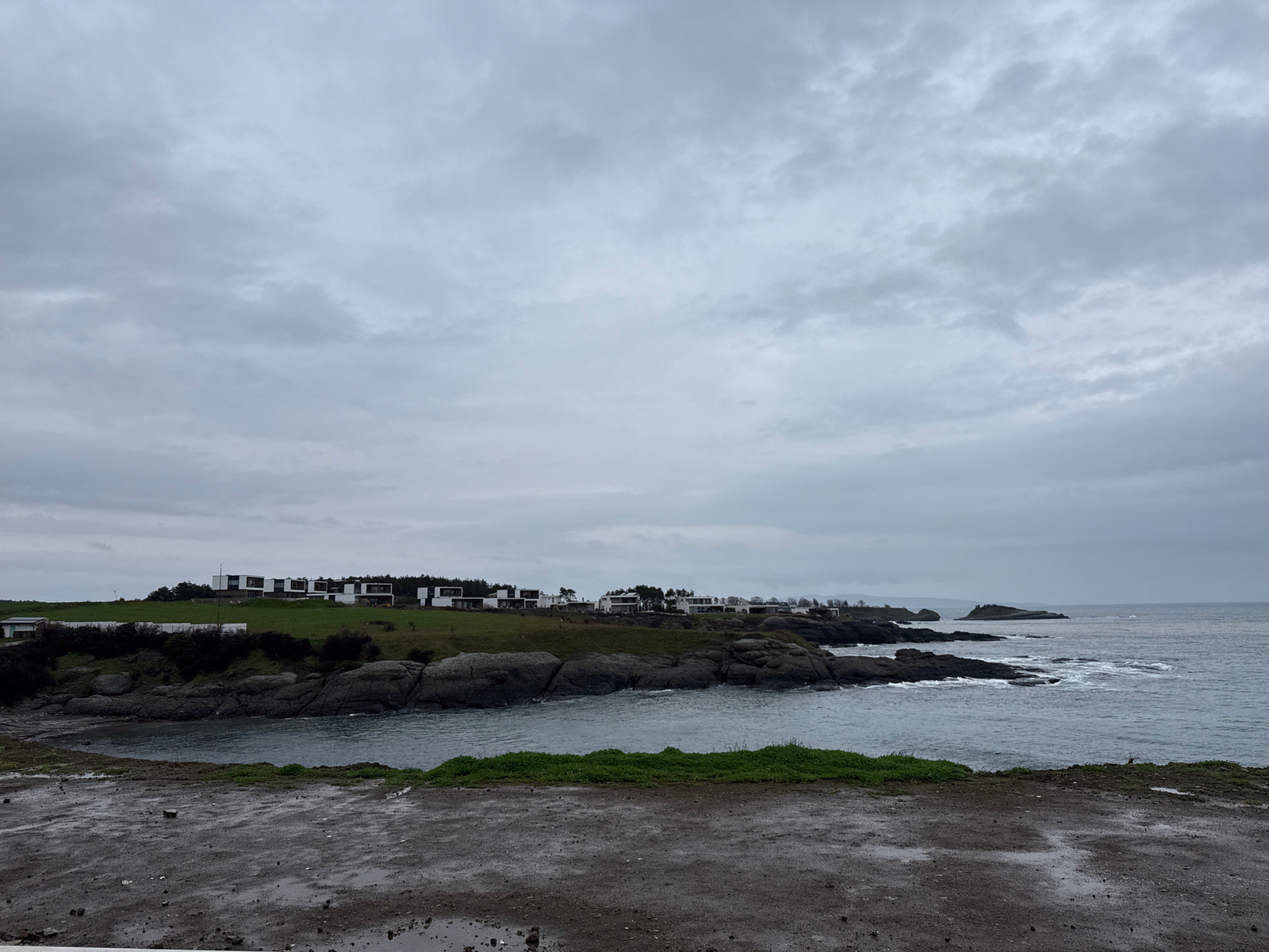 The image shows a coastal landscape in Tsarevo, Bulgaria, under an overcast sky. In the midground, a rocky coastline meets the sea, with small waves visible. Several modern, white buildings are situat…read more