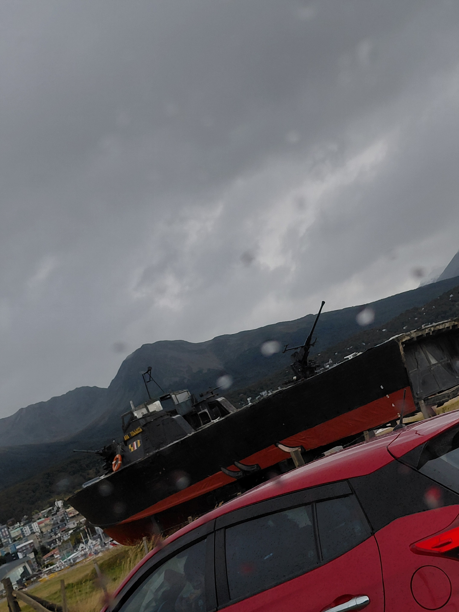 The image depicts a static scene in Ushuaia, Argentina, under an overcast, grey sky. A decommissioned naval patrol boat, identified by the visible text "ARA TEHUELCHE" on its black hull, dominates the…read more