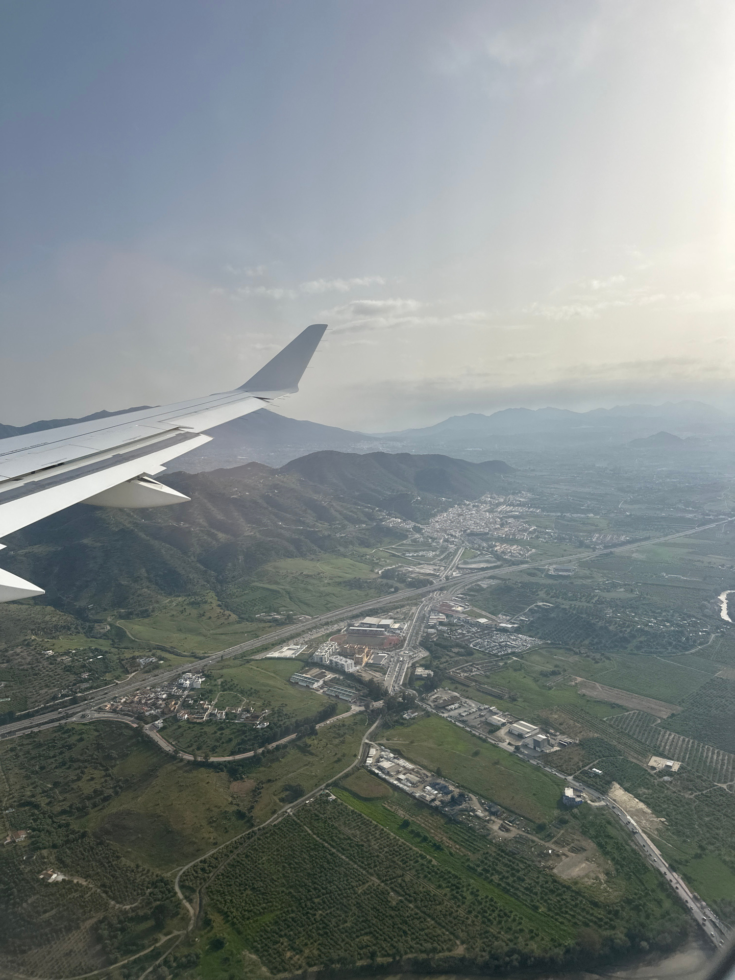 Aerial view of Almogía, Spain, from an airplane. The airplane's wing is visible in the lower-left corner. In the background are mountains shrouded in haze. The landscape includes green fields, cluster…read more