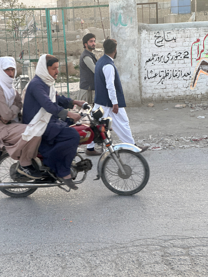 This image depicts an outdoor urban scene in Quetta City Tehsil, Pakistan. The foreground features a paved asphalt road under natural daylight. On the left, a red motorcycle with chrome accents, inclu…read more