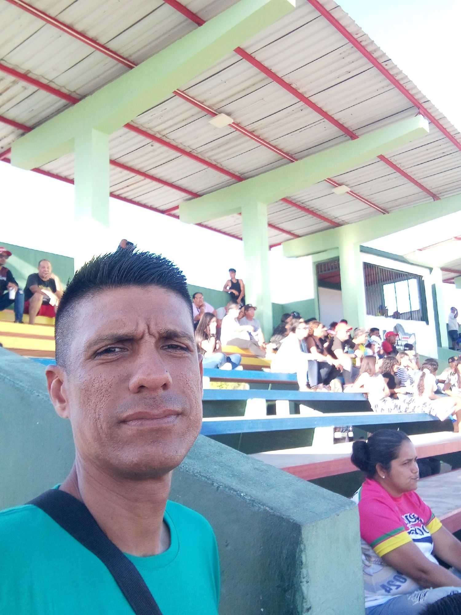 The image shows a man taking a selfie in front of a crowd of people seated in stadium bleachers. The location is likely a sports stadium in Juan Griego, Venezuela. The man is wearing a green shirt wit…read more