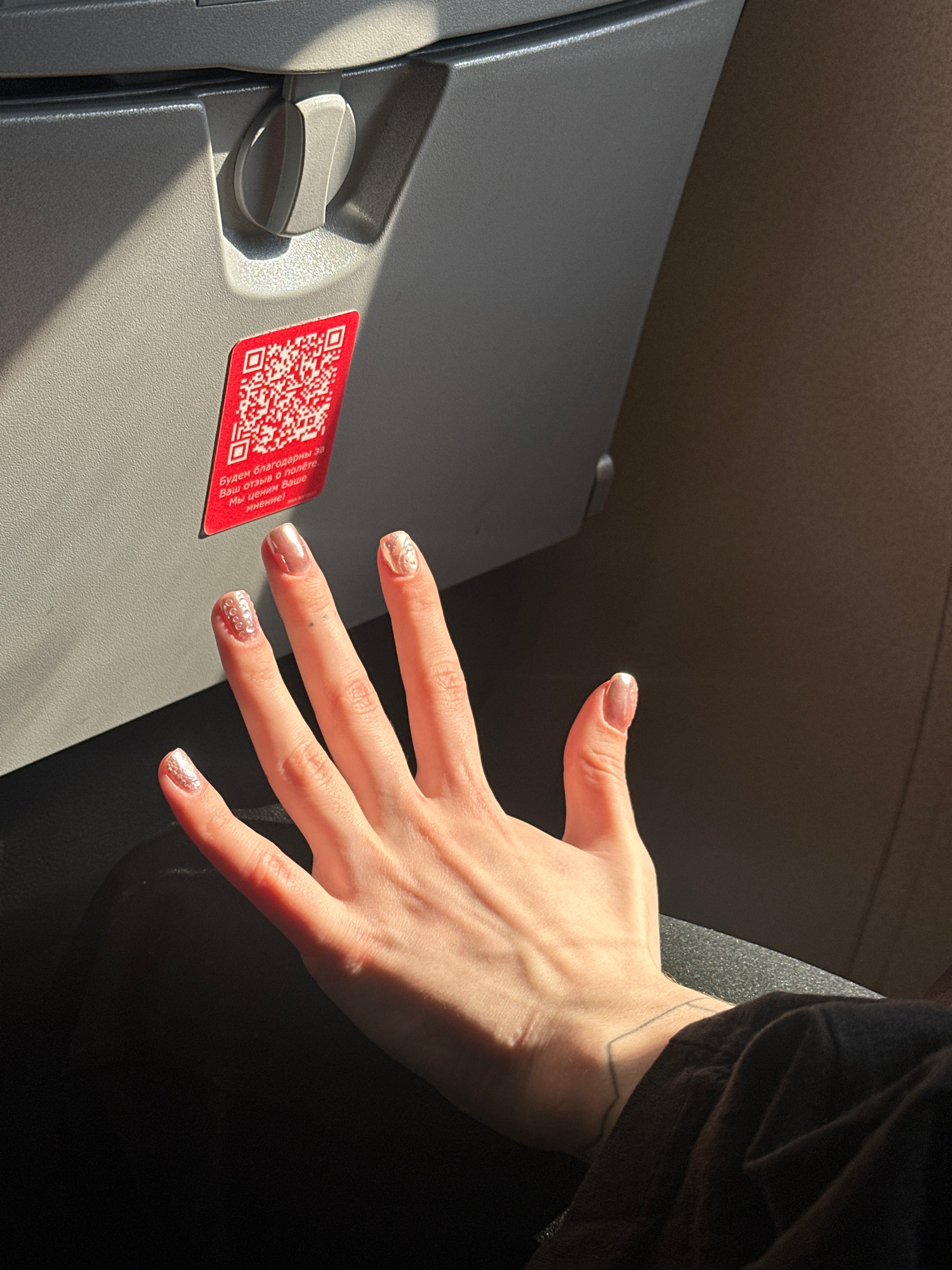 A passenger's hand extends toward a gray airplane tray table with a red QR code sticker in an aircraft cabin with the city, Unknown, Russia. The hand has nails with glittery accents. The person is wearing a black top. Light streams into the cabin, casting shadows. | Open Wire