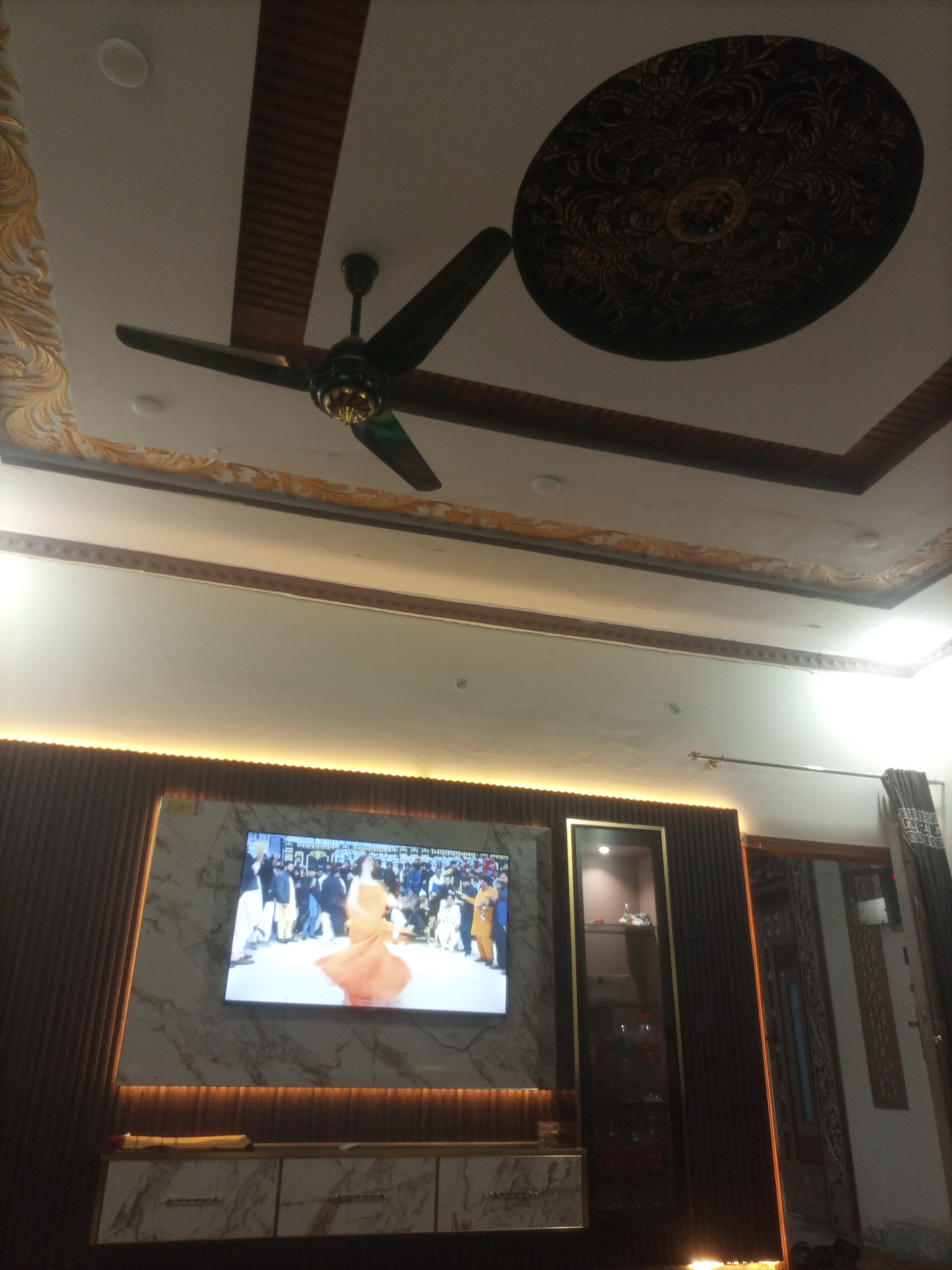 The image shows a living room interior in Samundri, Pakistan. A television is mounted on a marble-patterned wall with a recessed light strip above. The TV displays a scene of people in a public settin…read more