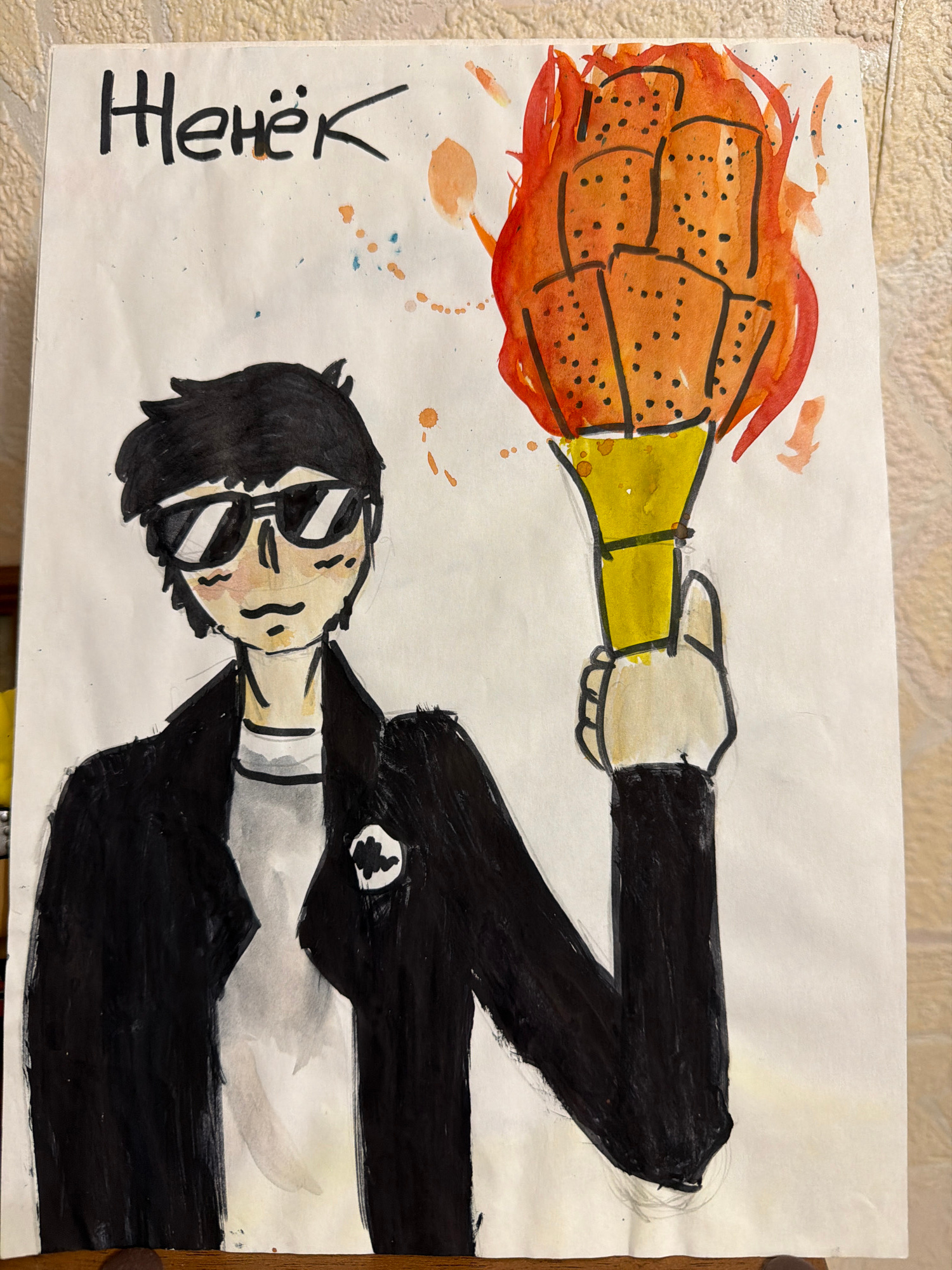 A hand-drawn, color image on white paper depicts a man holding a Molotov cocktail. The man has black hair, sunglasses, and wears a black suit with a white collar. He is holding a lit Molotov cocktail…read more