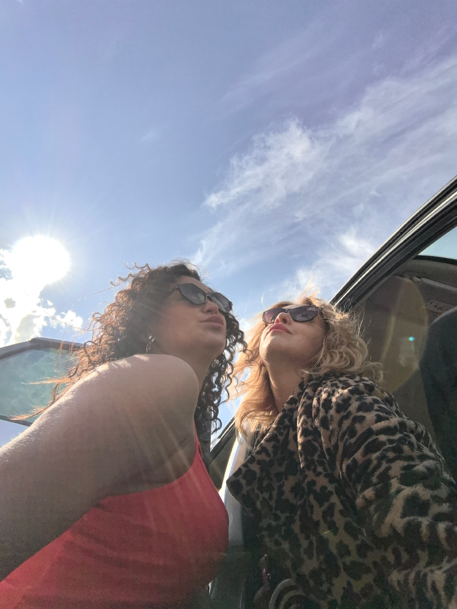 Two women are captured in a low-angle shot, looking upwards towards a bright, sunny sky from what appears to be a car, possibly a convertible or a vehicle with a sunroof, in Chaikovsky, Russia. The w…read more