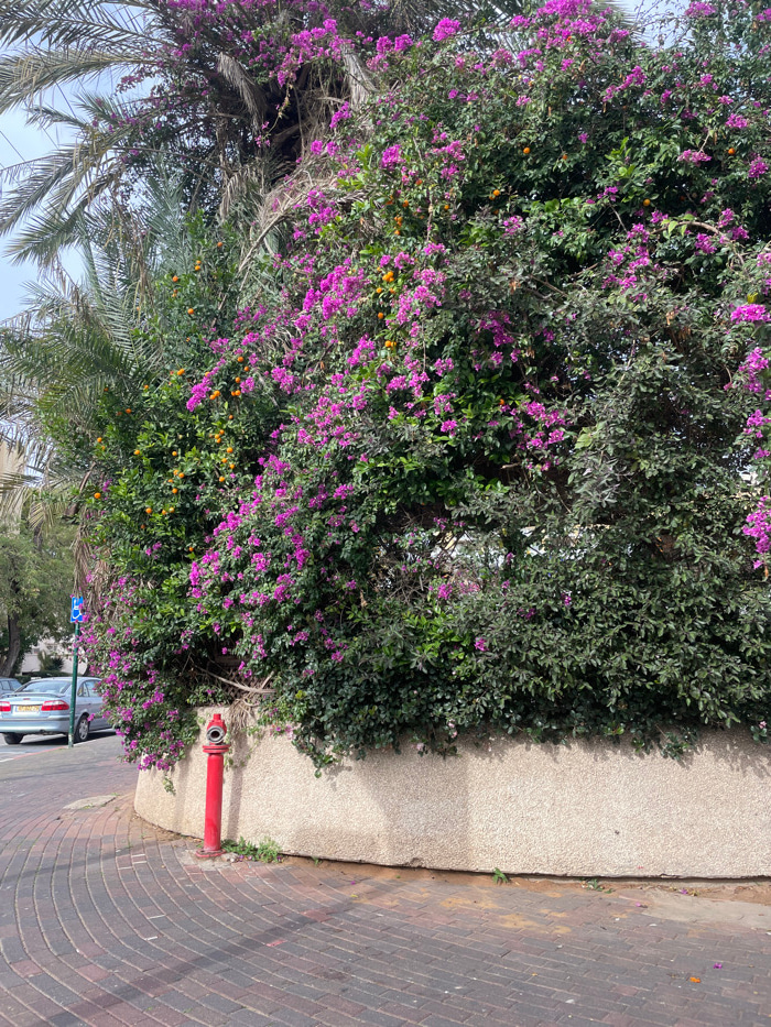 The image displays an urban street corner in Raanana, Israel, under a partly cloudy sky. In the foreground, a curved sidewalk paved with reddish-brown bricks, arranged in a circular pattern, extends f…read more