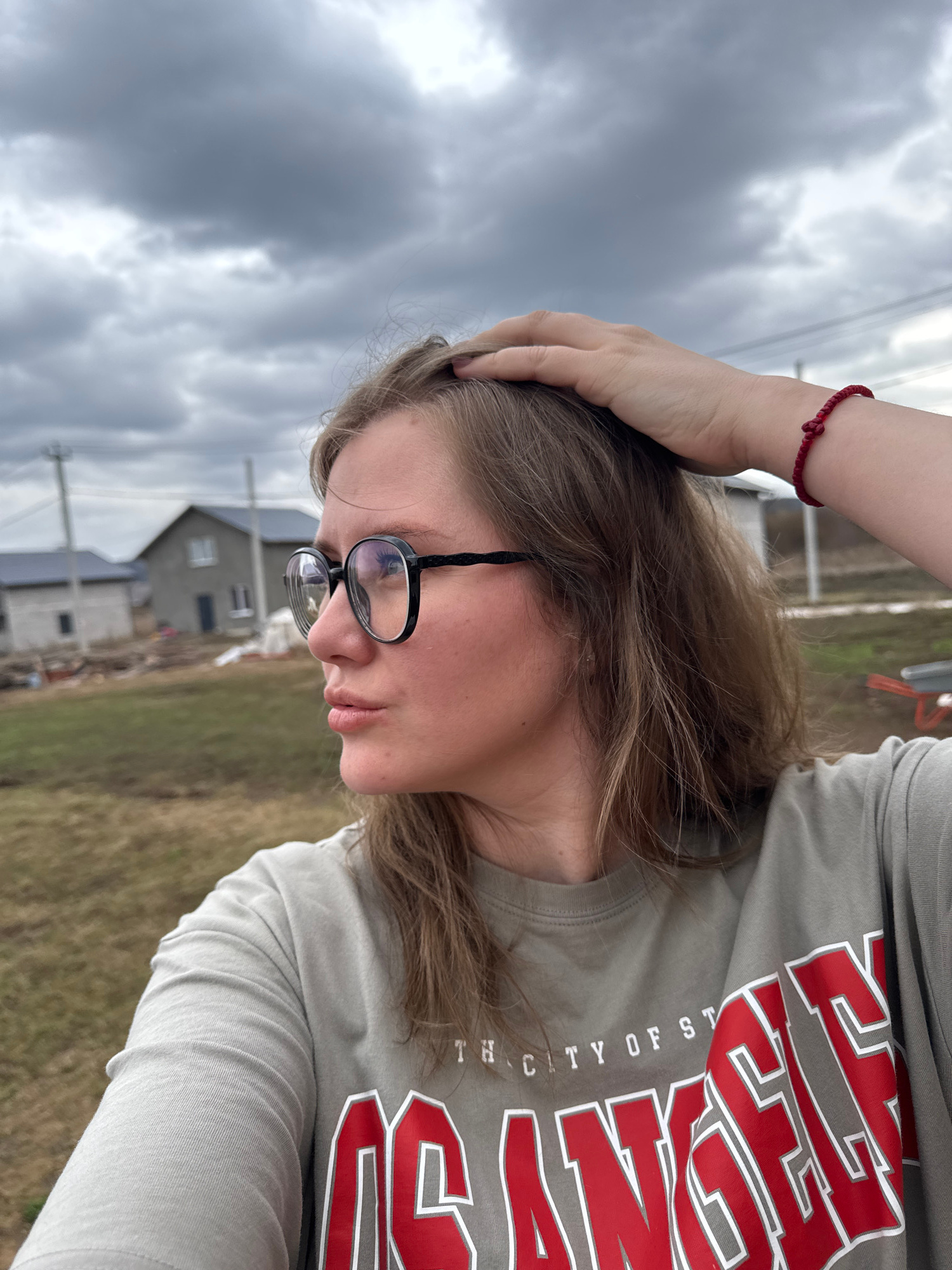 A young person with light brown hair and glasses is shown in a selfie-style image. They wear a gray t-shirt with red lettering that reads "CITY OF ST..." (partially obscured). The person's left hand r…read more