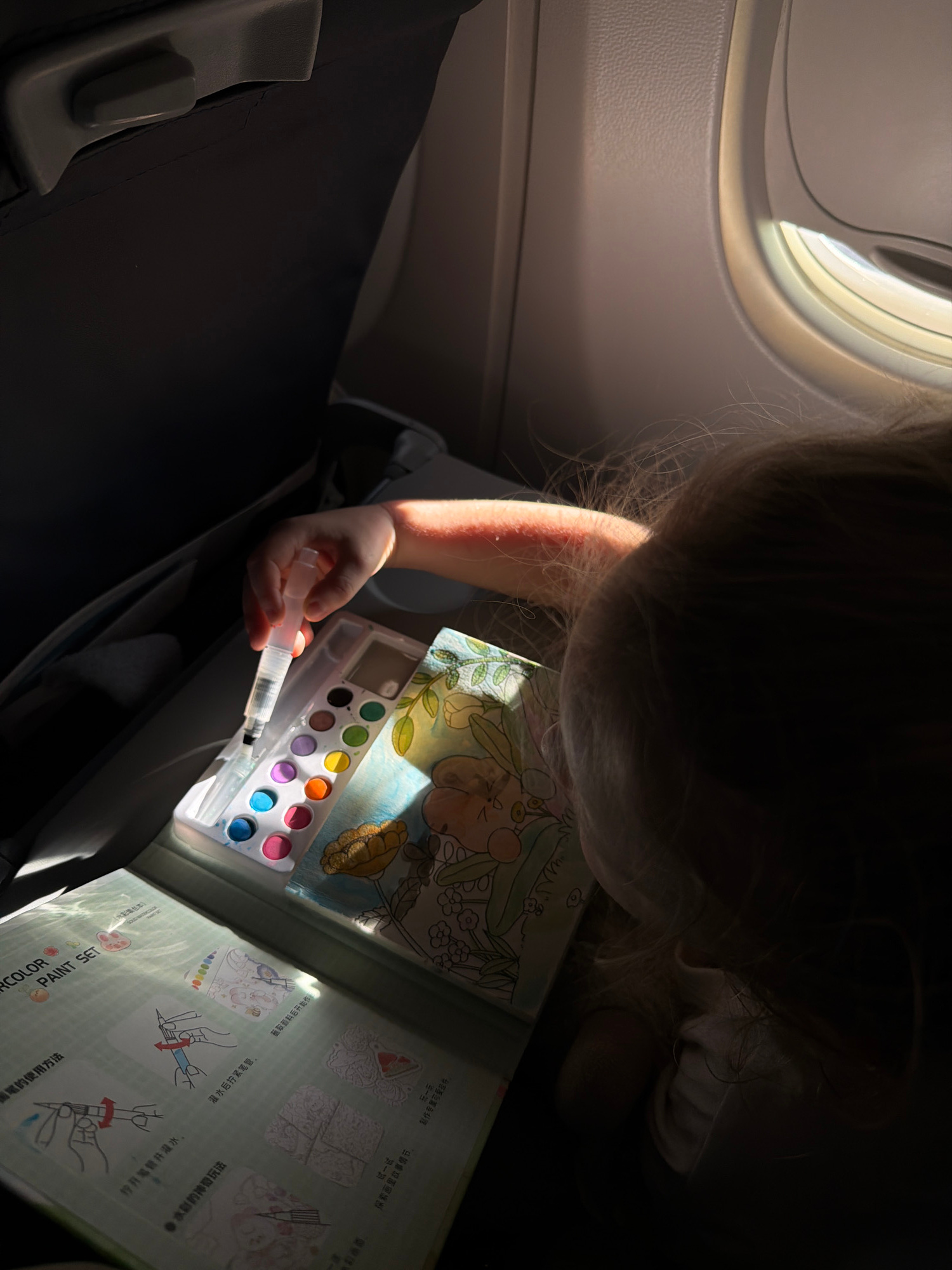A child is sitting on an airplane and coloring in a watercolor paint book. The child is holding a watercolor brush filled with water. There is a window to the left of the child and the airplane seat i…read more