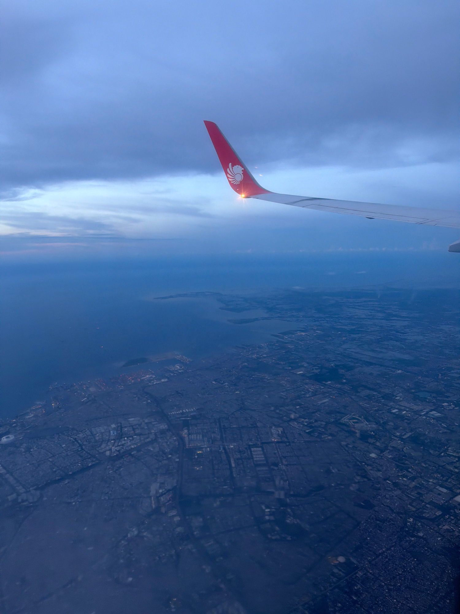 The image shows a view from an airplane, presumably taking off or landing. In the upper left, the red and white wing of a Lion Air plane is visible. Below the wing, there is a layer of clouds. The rigβ¦read more