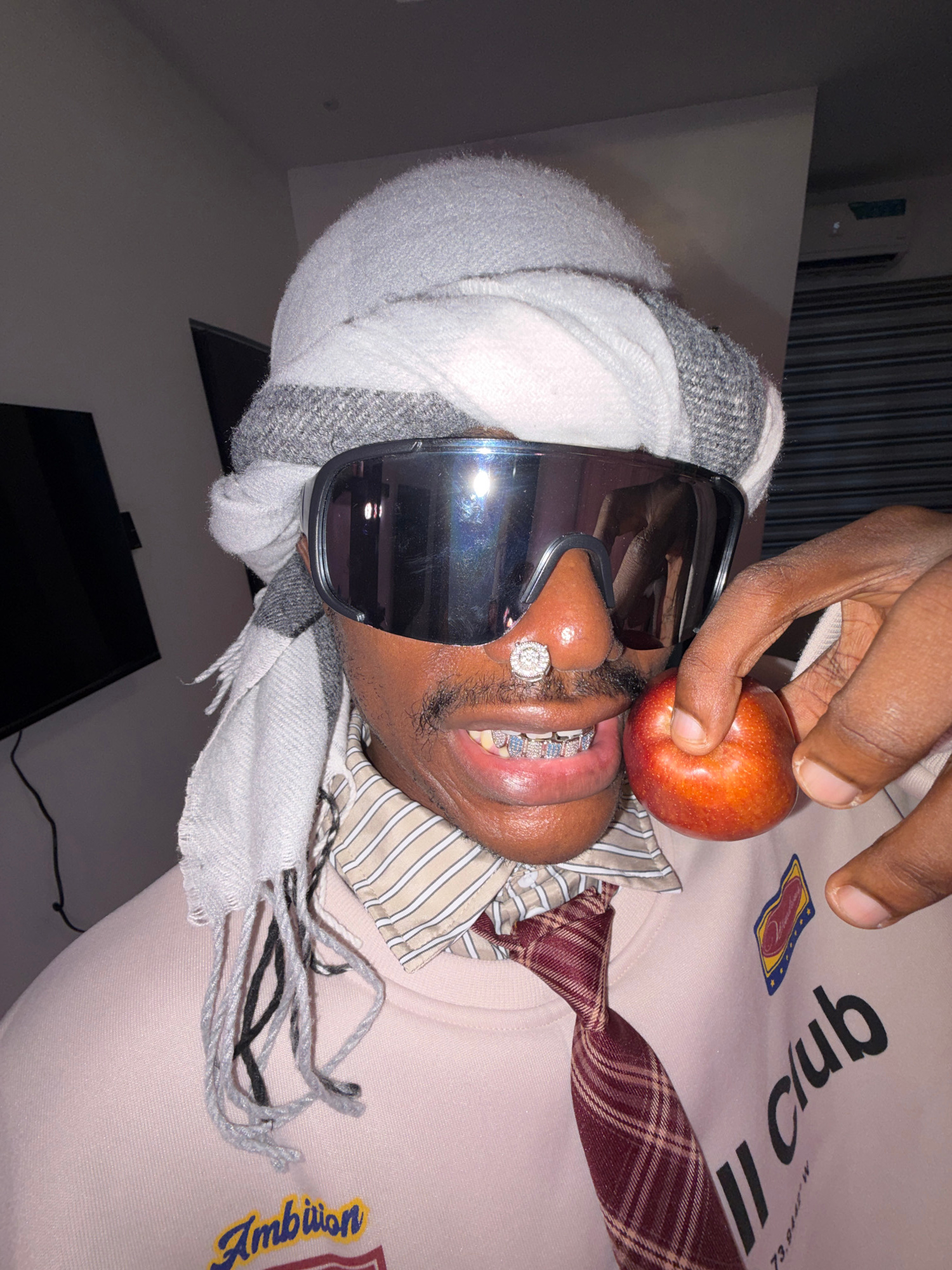 A man wearing sunglasses, a gray and white scarf, and a diamond ring on his nose holds an apple up to his face. He has a diamond-encrusted grill on his teeth and is wearing a tie and a light pink swea…read more