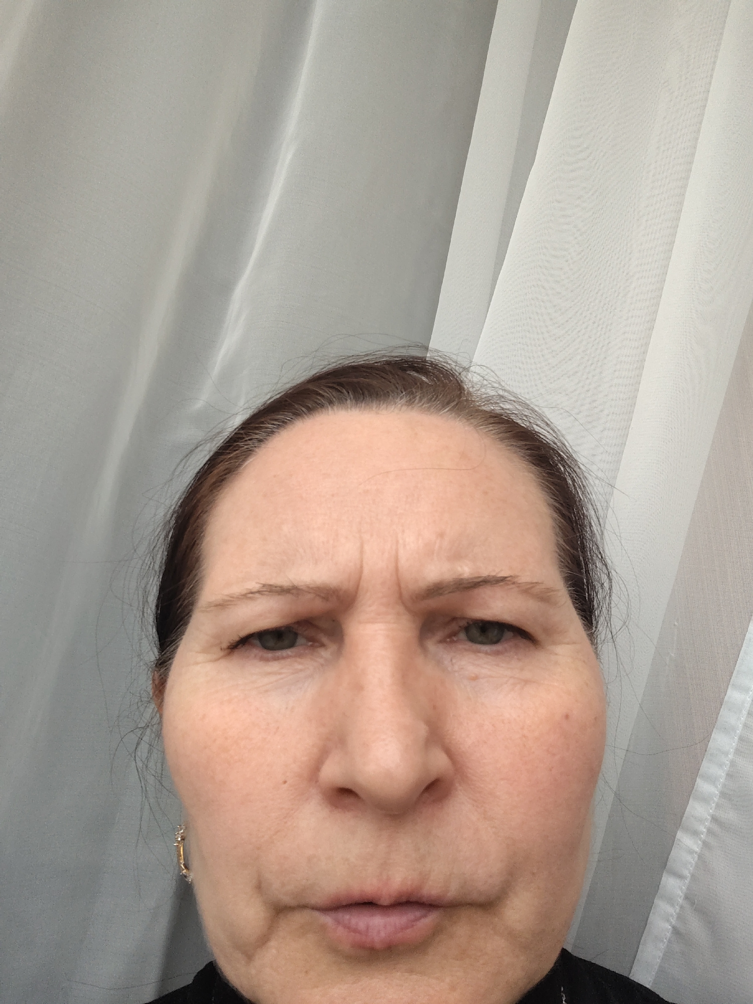 A close-up portrait features a woman with an expression of mild concern or contemplation, looking directly at the camera. Her eyebrows are furrowed, creating horizontal lines across her forehead, and…read more
