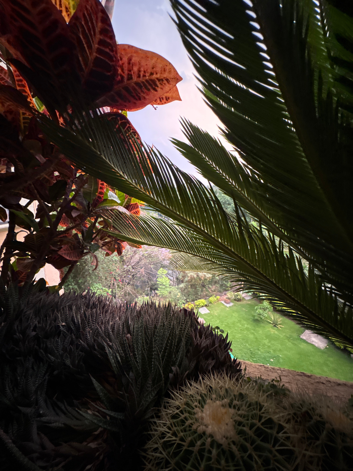 The image presents a view looking outwards from an elevated position in Cuernavaca, Mexico. The foreground is filled with dense foliage: the spiky fronds of a sago palm, patterned red and yellow croto…read more