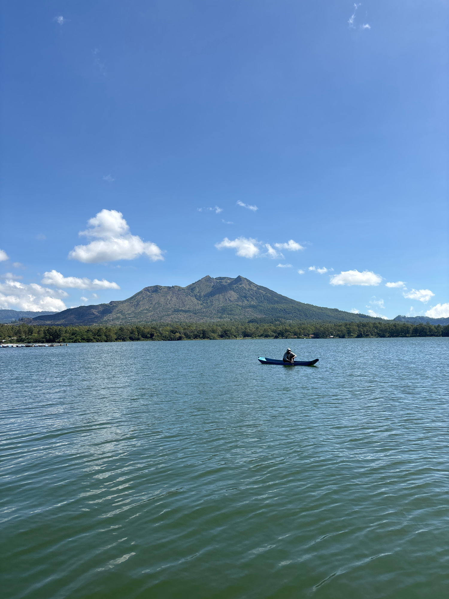 A horizontal outdoor shot depicts a large body of water, likely Lake Batur, next to a prominent mountain and a bright blue sky with scattered white clouds. A person is seated in a blue kayak in the ce…read more