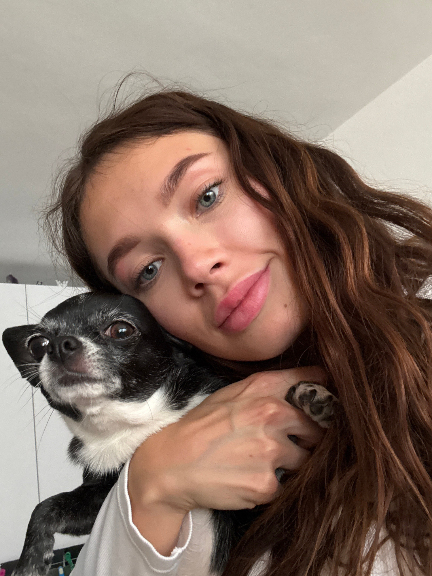 A woman with long brown wavy hair is holding a black and white dog close to her face. The woman has light skin, blue eyes, and pink lips. She is looking directly at the camera. The dog is a small bree…read more