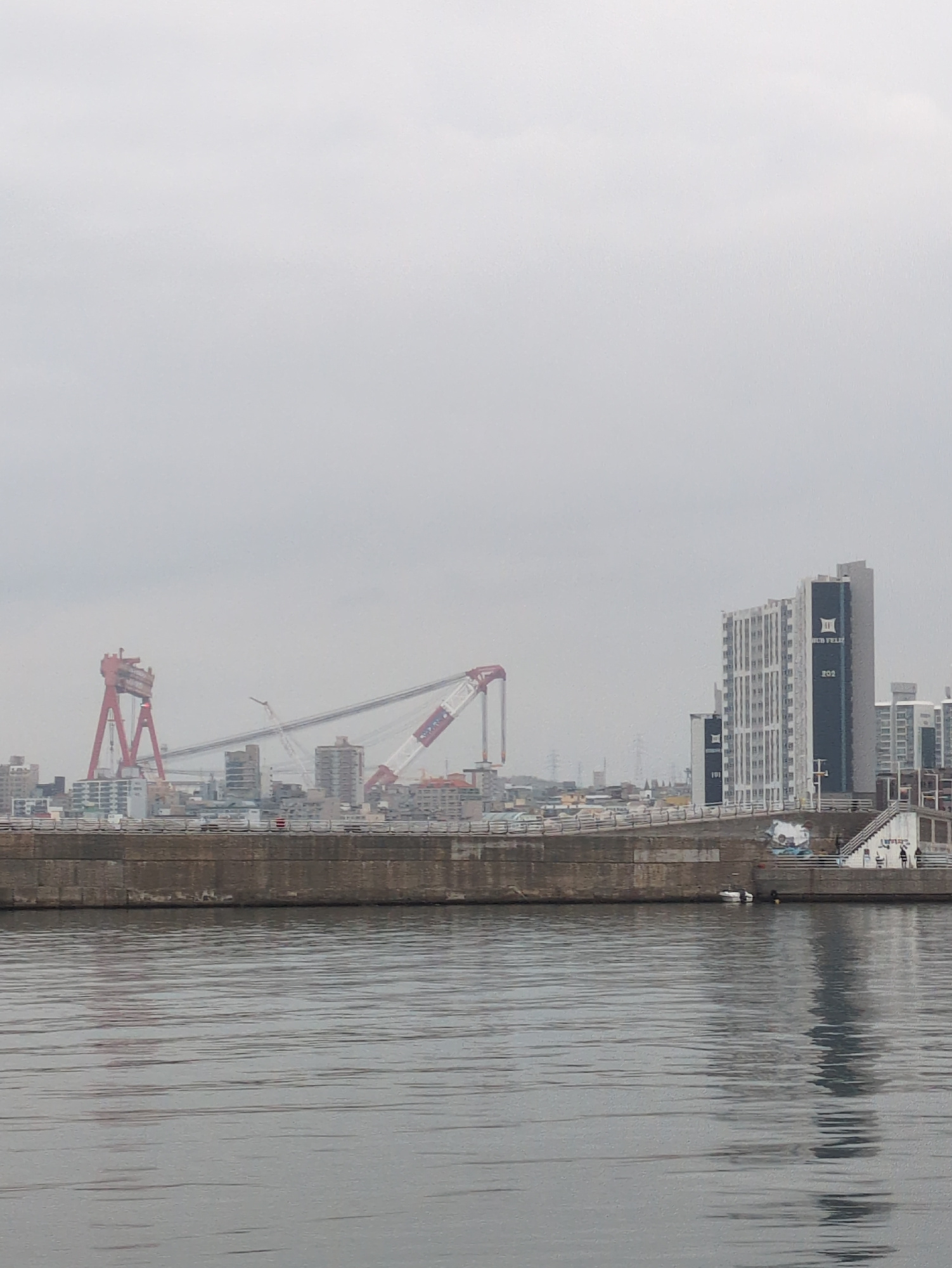 This image depicts an industrial waterfront scene in Ulsan, South Korea, captured on an overcast day. The composition is split between land-based structures and a quay on the left side, and a body ofโฆread more