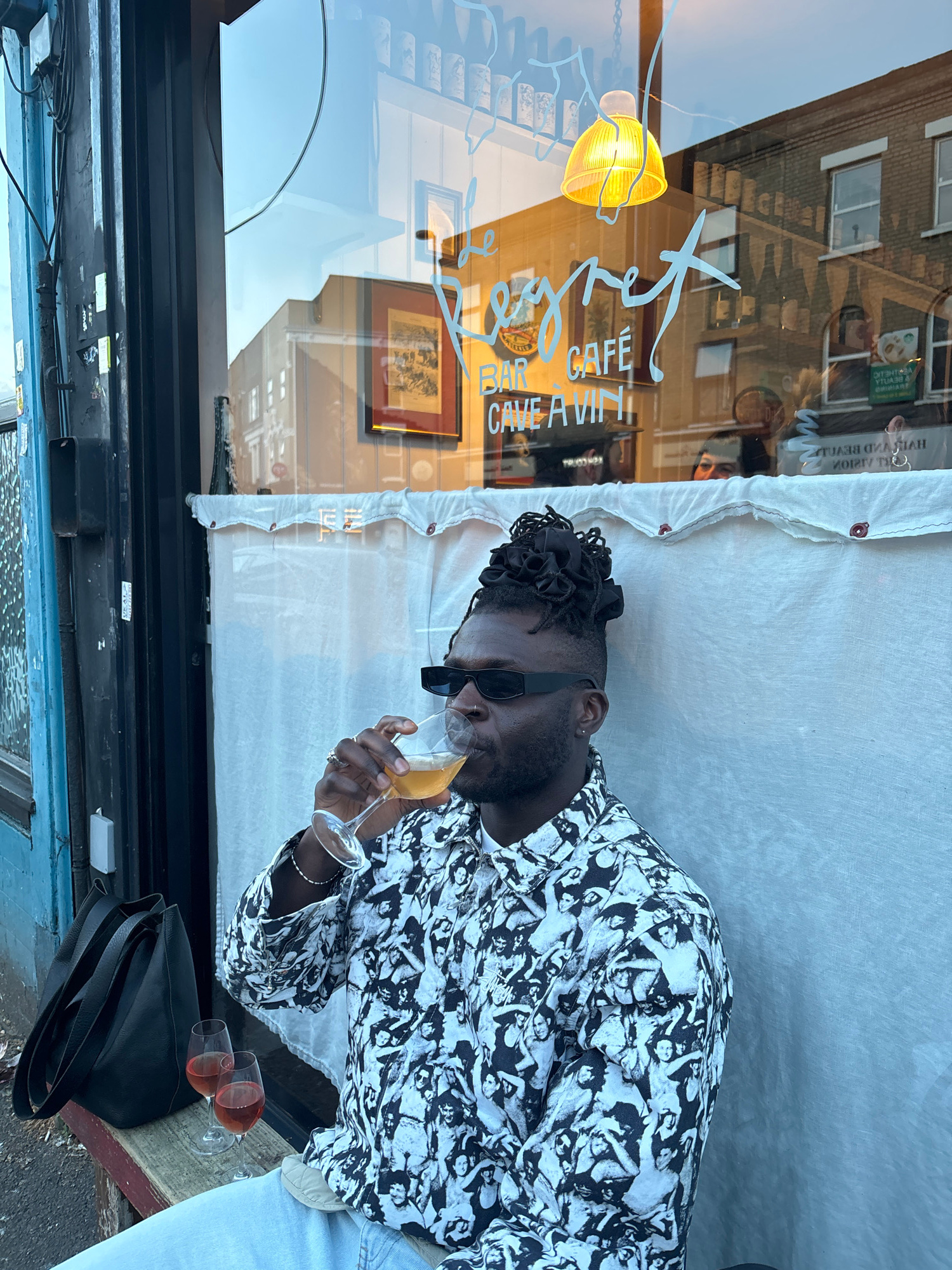 A Black man with dark sunglasses is drinking a glass of orange liquid at a table outside of a cafe. He is wearing a black and white patterned shirt and has his hair up. The cafe window says "L'Art Caf…read more