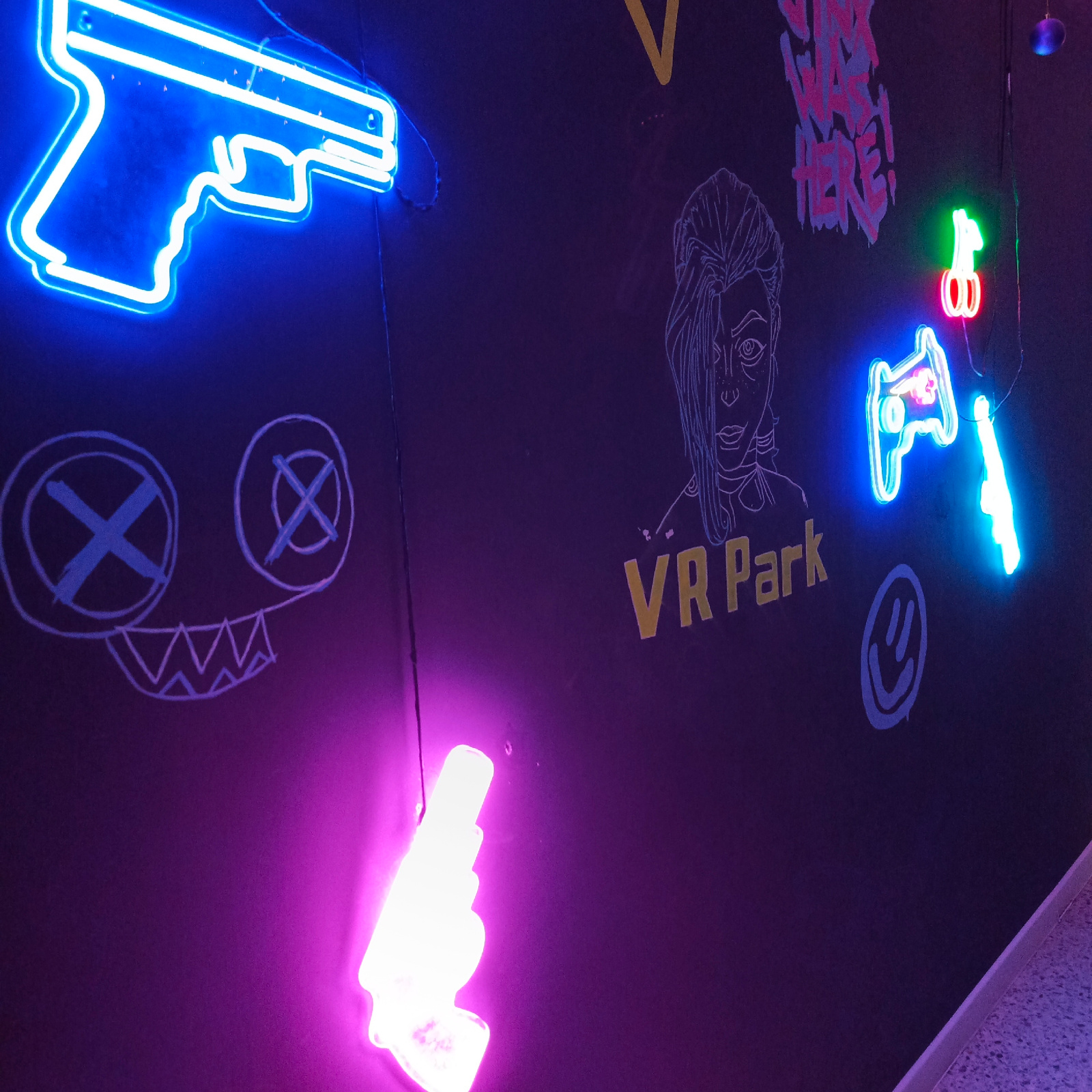 The image depicts an interior wall at "VR Park" in Chaikovsky, Russia. The dark wall features several neon signs, including the shape of a gun in blue, a pair of cherries in red and green, and another…read more