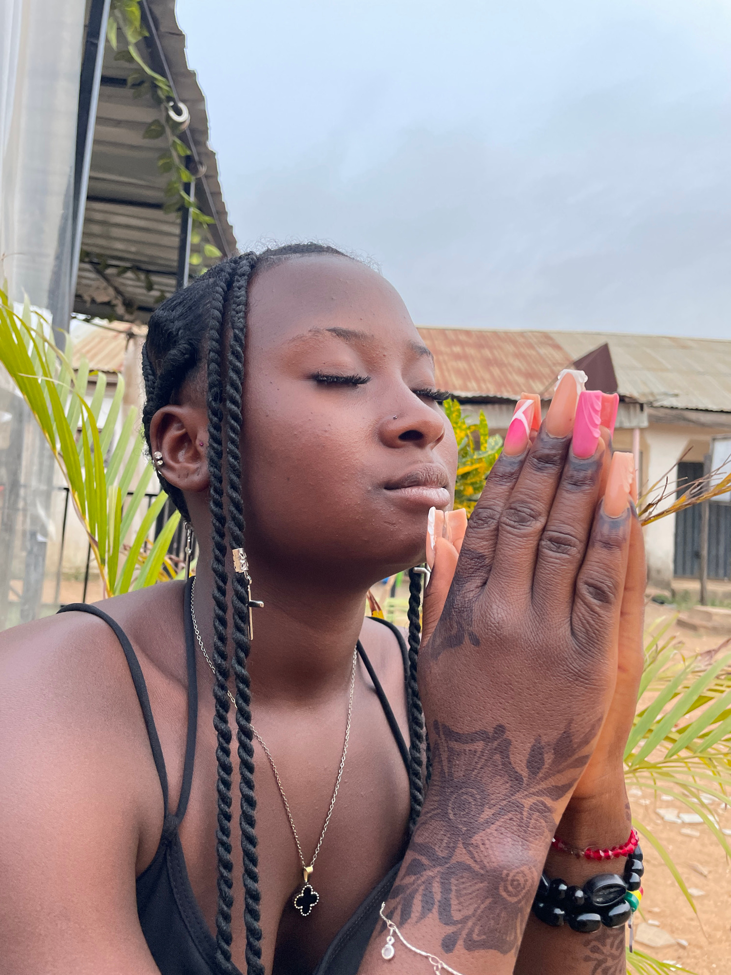 A young, dark-skinned woman is shown in the image. She has her eyes closed, seemingly in a meditative or relaxed state. Her hair is styled in braids, and she wears a black top. Several pieces of jewel…read more