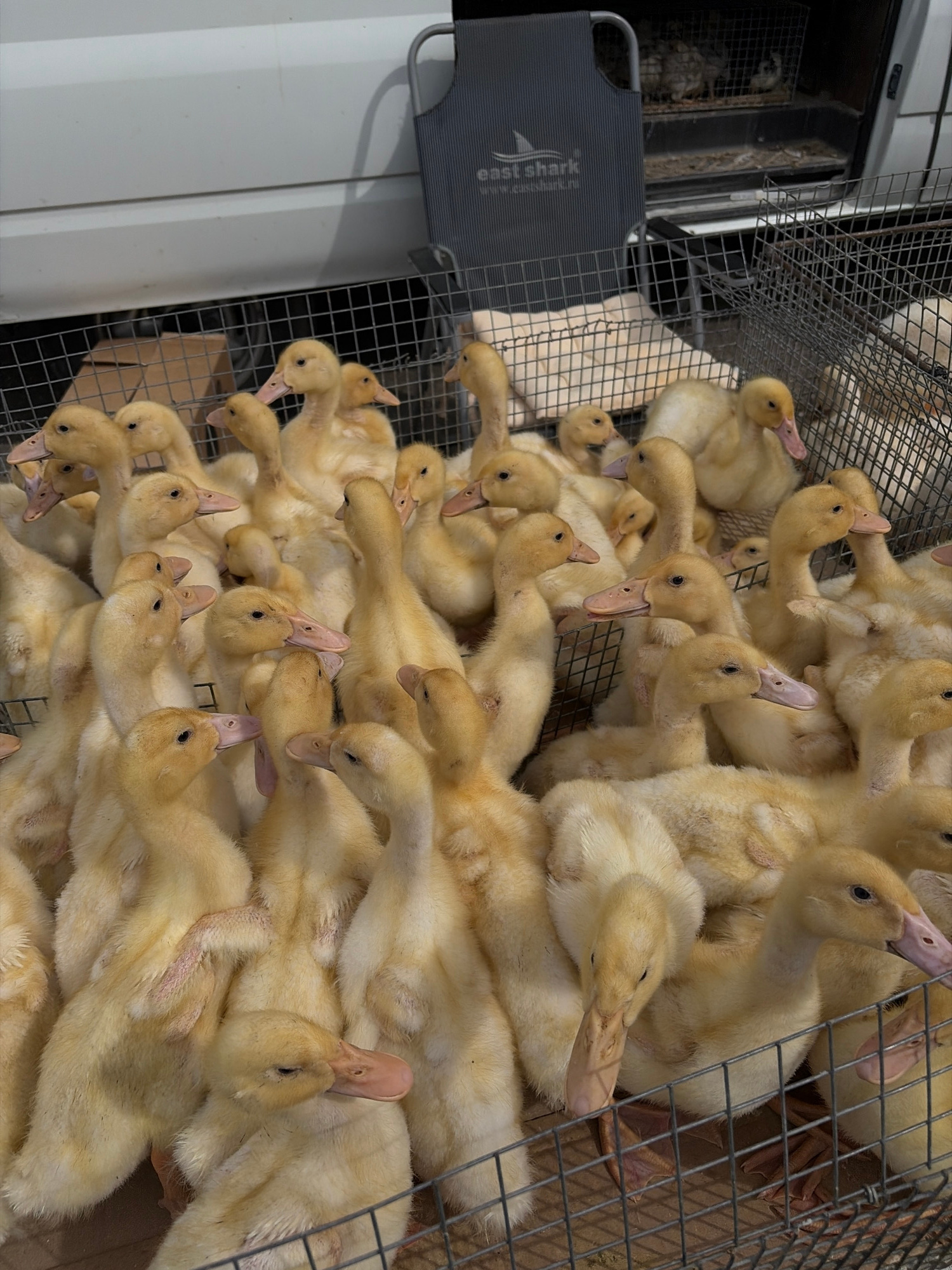 A large group of yellow ducklings are crowded in a wire cage. The location is Novopokrovskaya, Russia.