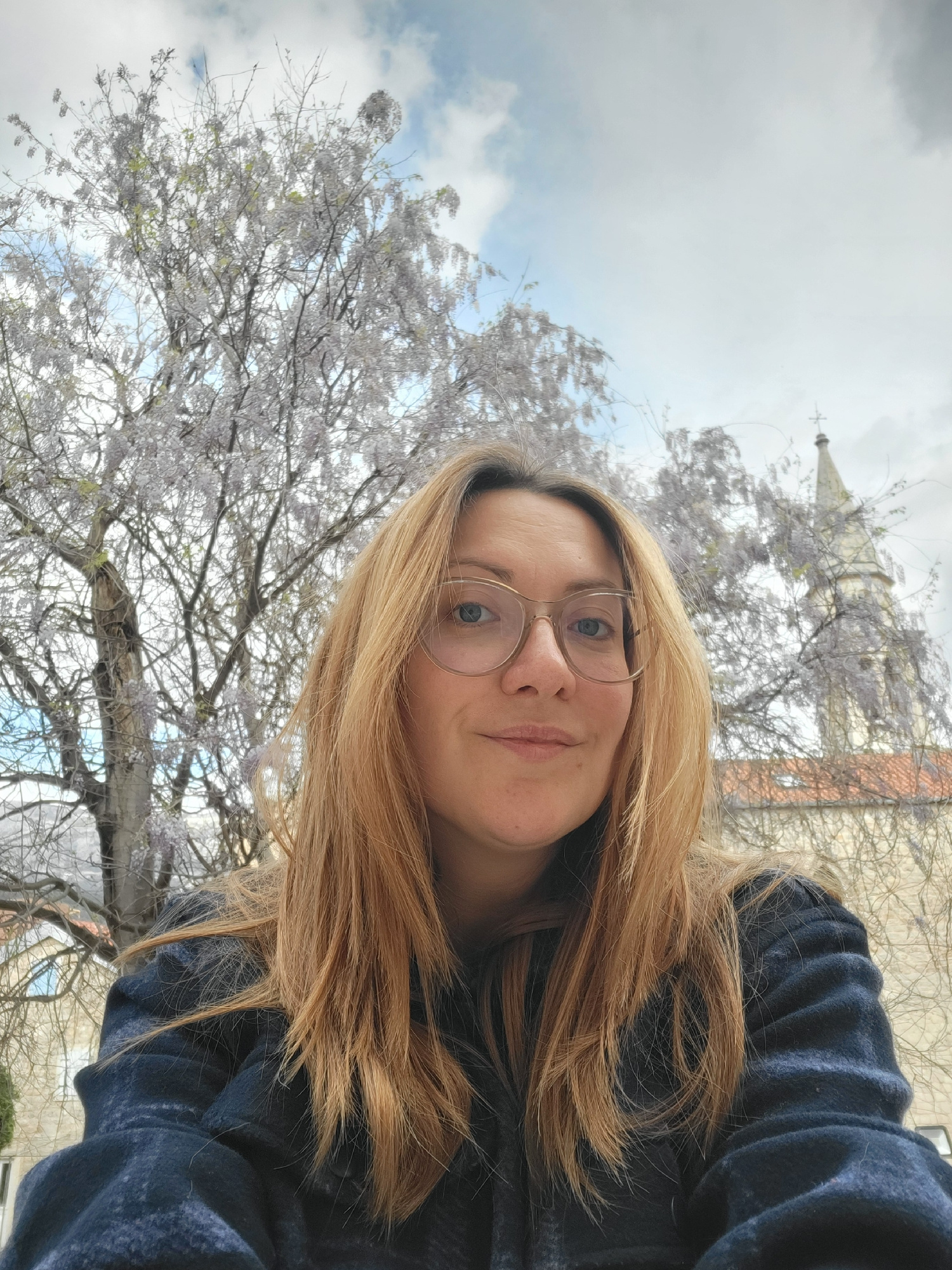 A woman with glasses is taking a selfie in Budva, Montenegro. Behind her is a tree with white flowers, and a tall building in the background. The sky is partly cloudy. She is wearing a dark blue sweat…read more