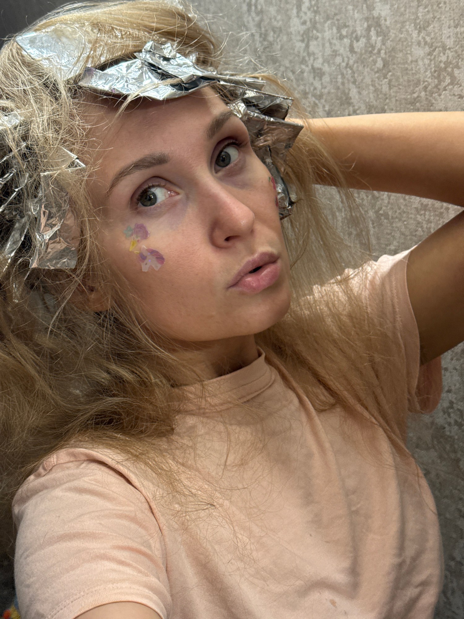 A young Caucasian woman with long blonde hair is lying down, with her head tilted and facing the camera. Her hair appears to be in the process of being highlighted, as sections of it are wrapped in al…read more