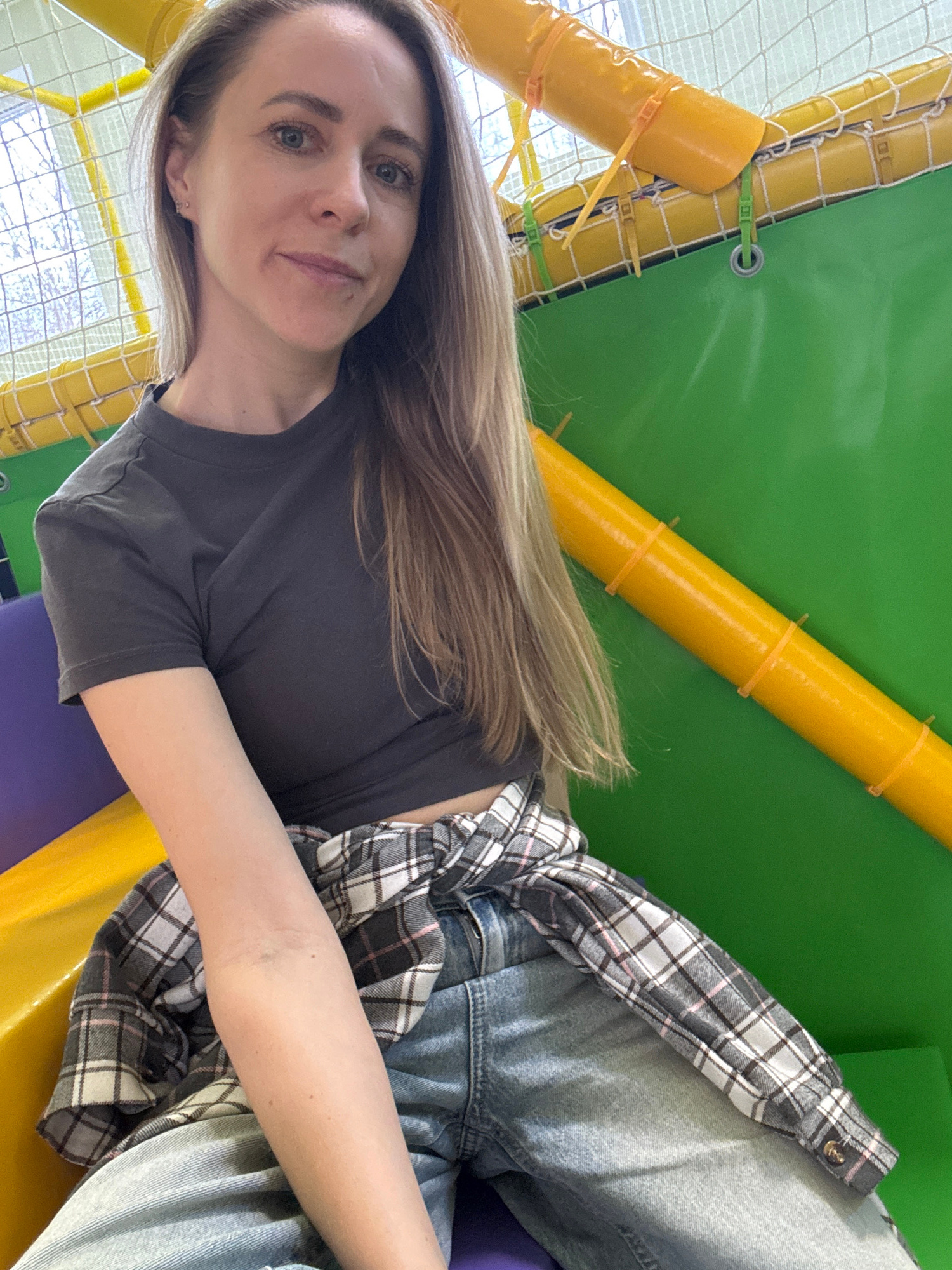 A woman with long, light-brown hair is positioned in front of a colorful indoor playground structure. She is wearing a gray T-shirt, blue jeans, and a gray-and-white plaid shirt tied around her waist.…read more