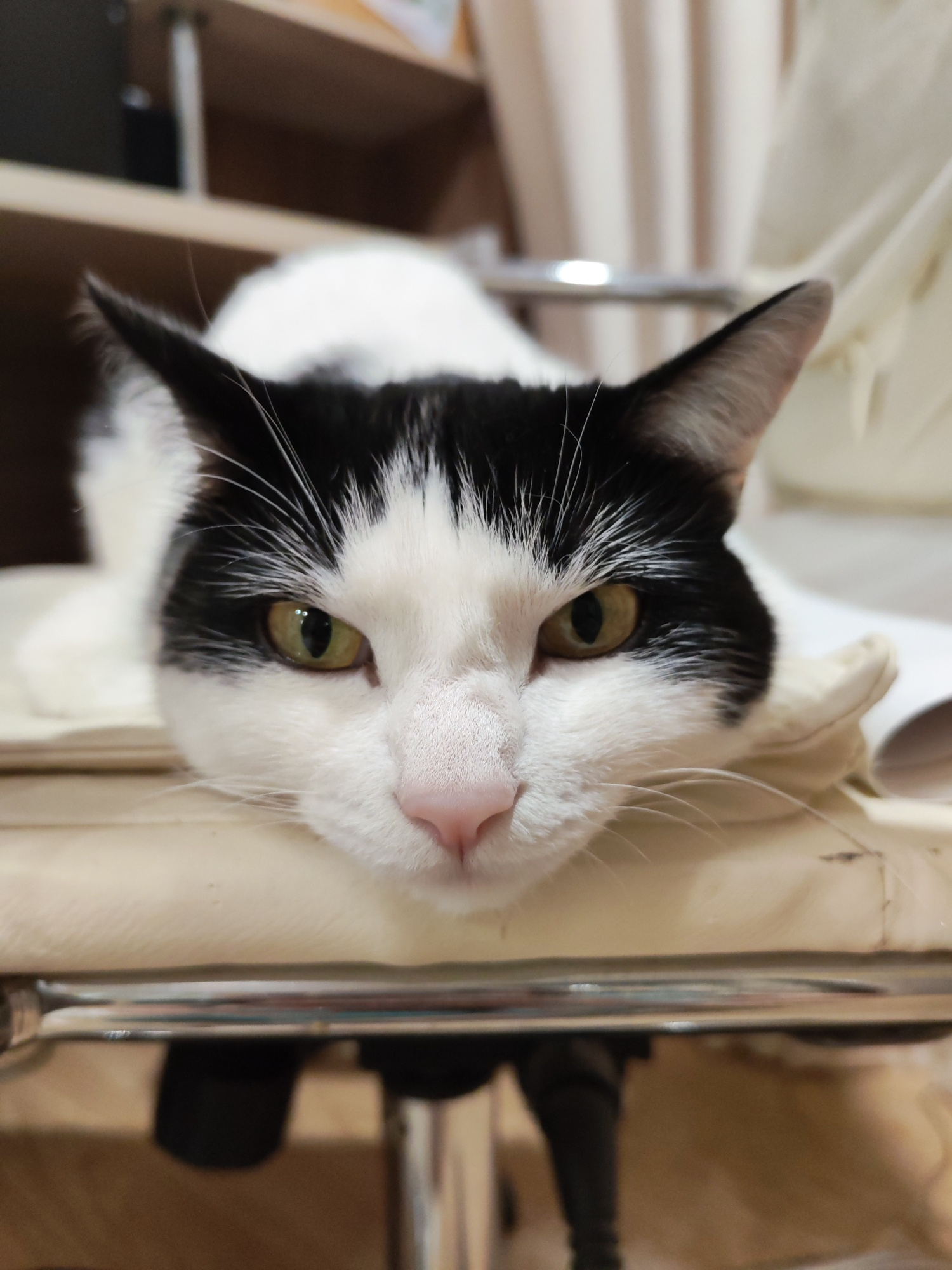 A close-up portrait captures a black and white cat resting indoors, its head positioned centrally in the frame. The cat has striking bright green-yellow eyes that look directly at the viewer with an i…read more