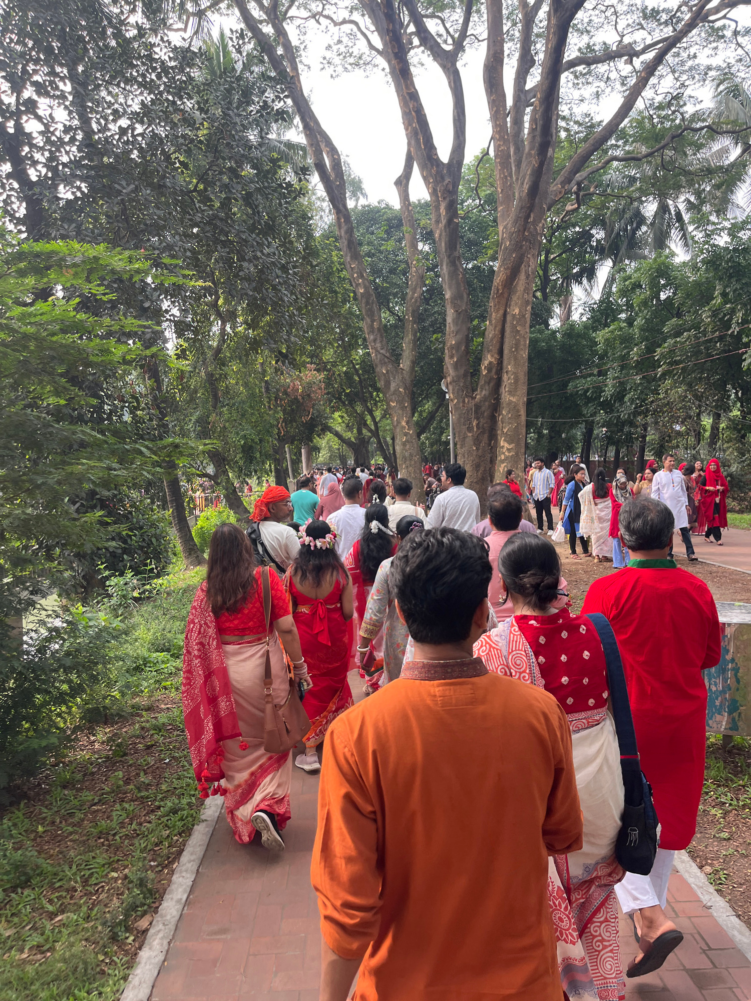 A procession of people walk on a brick-laid path in what appears to be a park setting in Dhaka, Bangladesh. The participants are dressed in traditional clothing, predominantly shades of red, orange, a…read more
