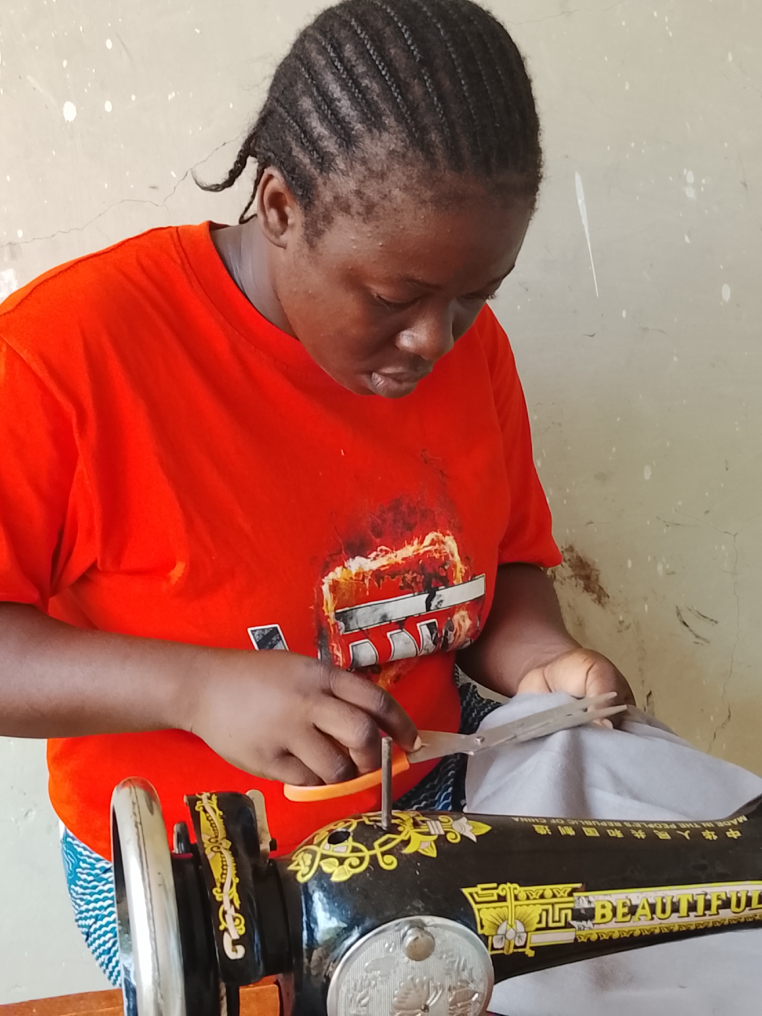 A woman with braided hair wearing an orange t-shirt is shown using scissors to cut gray fabric while standing at an old black sewing machine. The machine has the word "BEAUTIFUL" printed on it and wha…read more