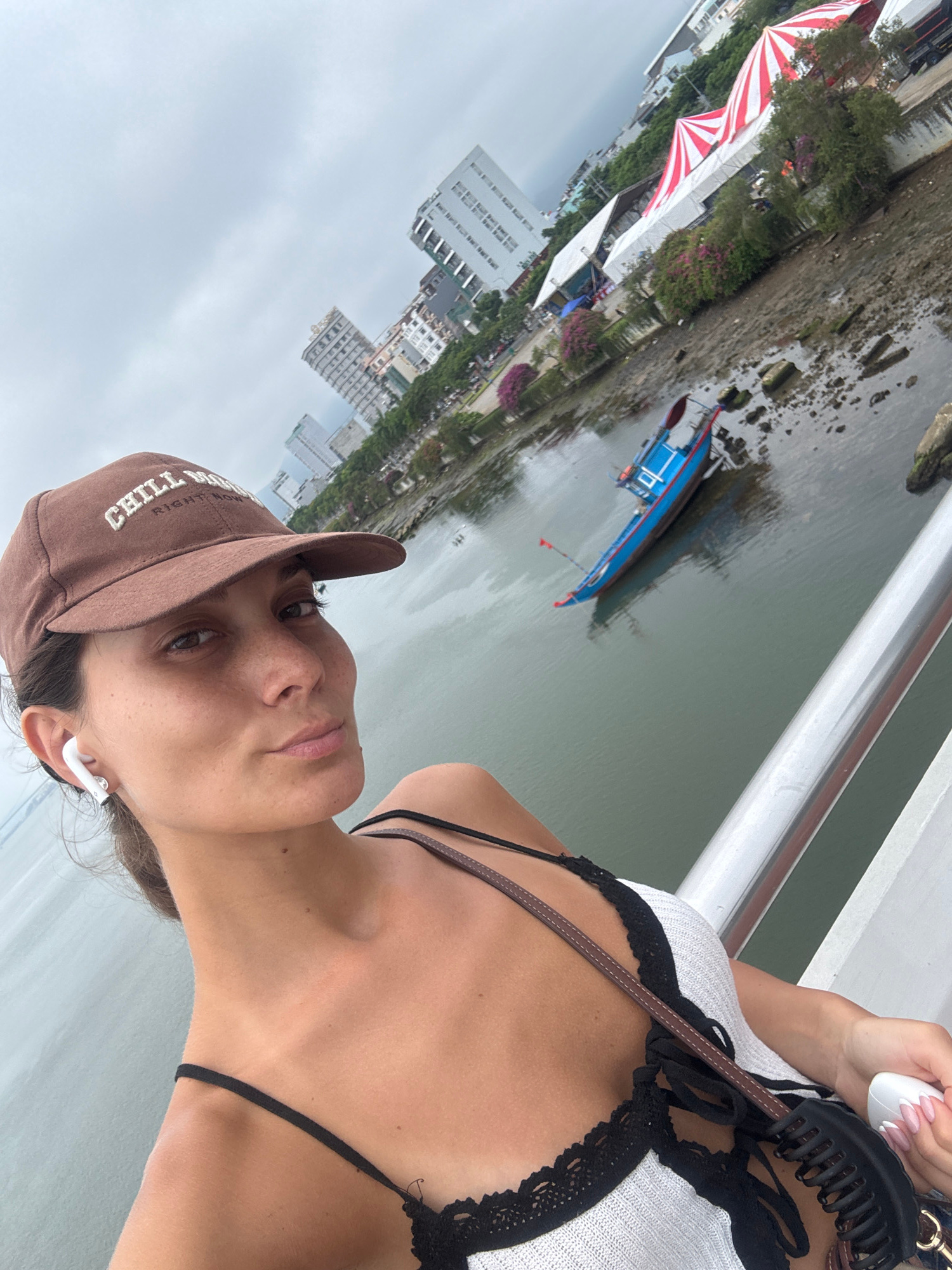 A person with light skin wearing a brown baseball cap and a white and black top is looking at the camera. They have light brown hair and are wearing an earbud in their right ear. A black purse hangs o…read more