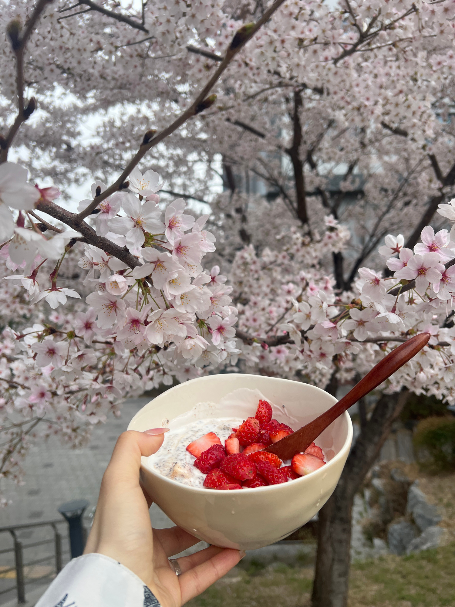 A person is holding a bowl of strawberries and what appears to be chia seed pudding with a wooden spoon in it. The scene is set outdoors, and flowering cherry trees are in the background. It appears t…read more