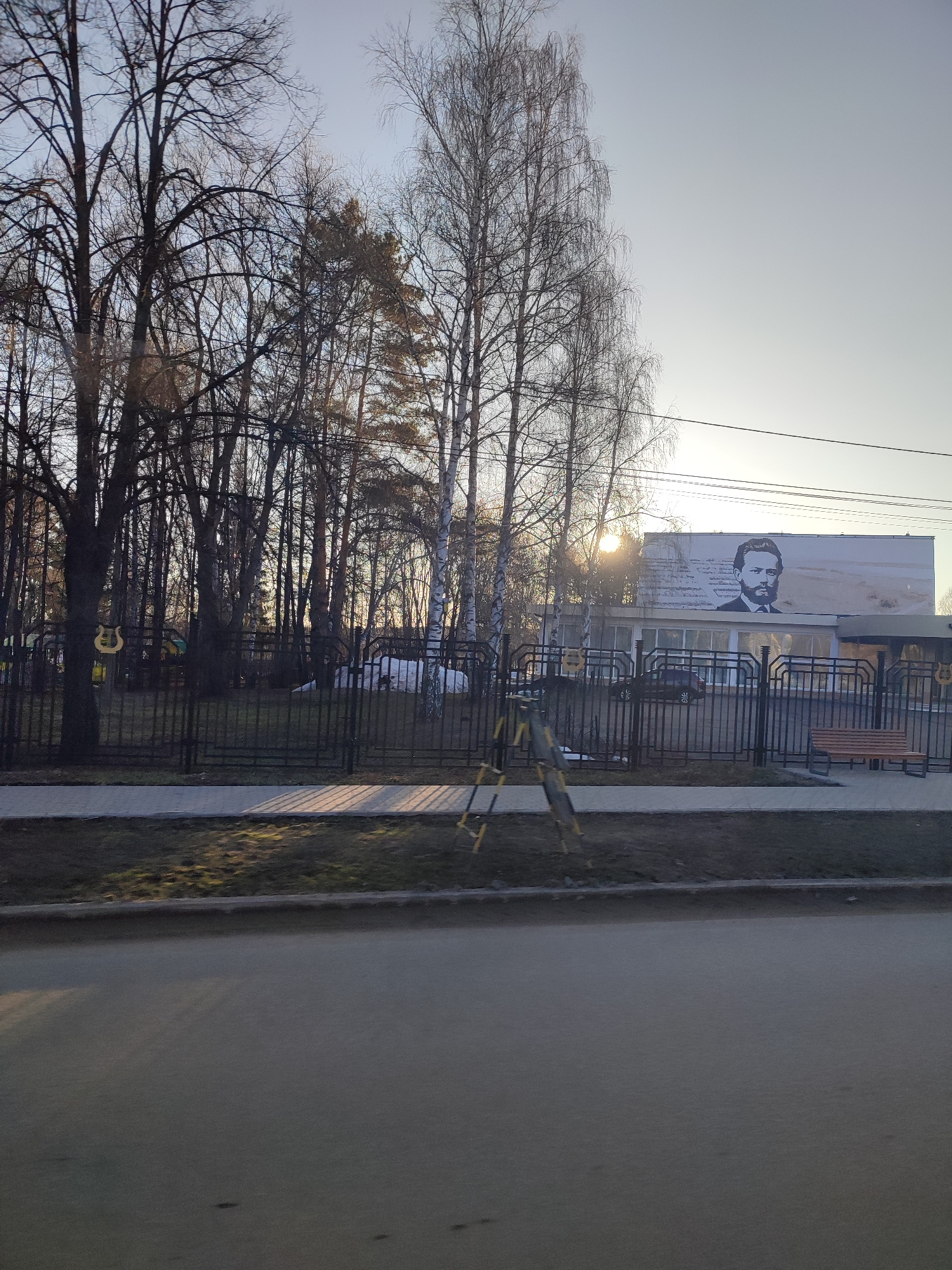 The image shows an exterior view in what is probably Chaikovsky, Russia, based on the mural of Pyotr Ilyich Tchaikovsky on the building. A black wrought-iron fence runs across the midground, separatin…read more