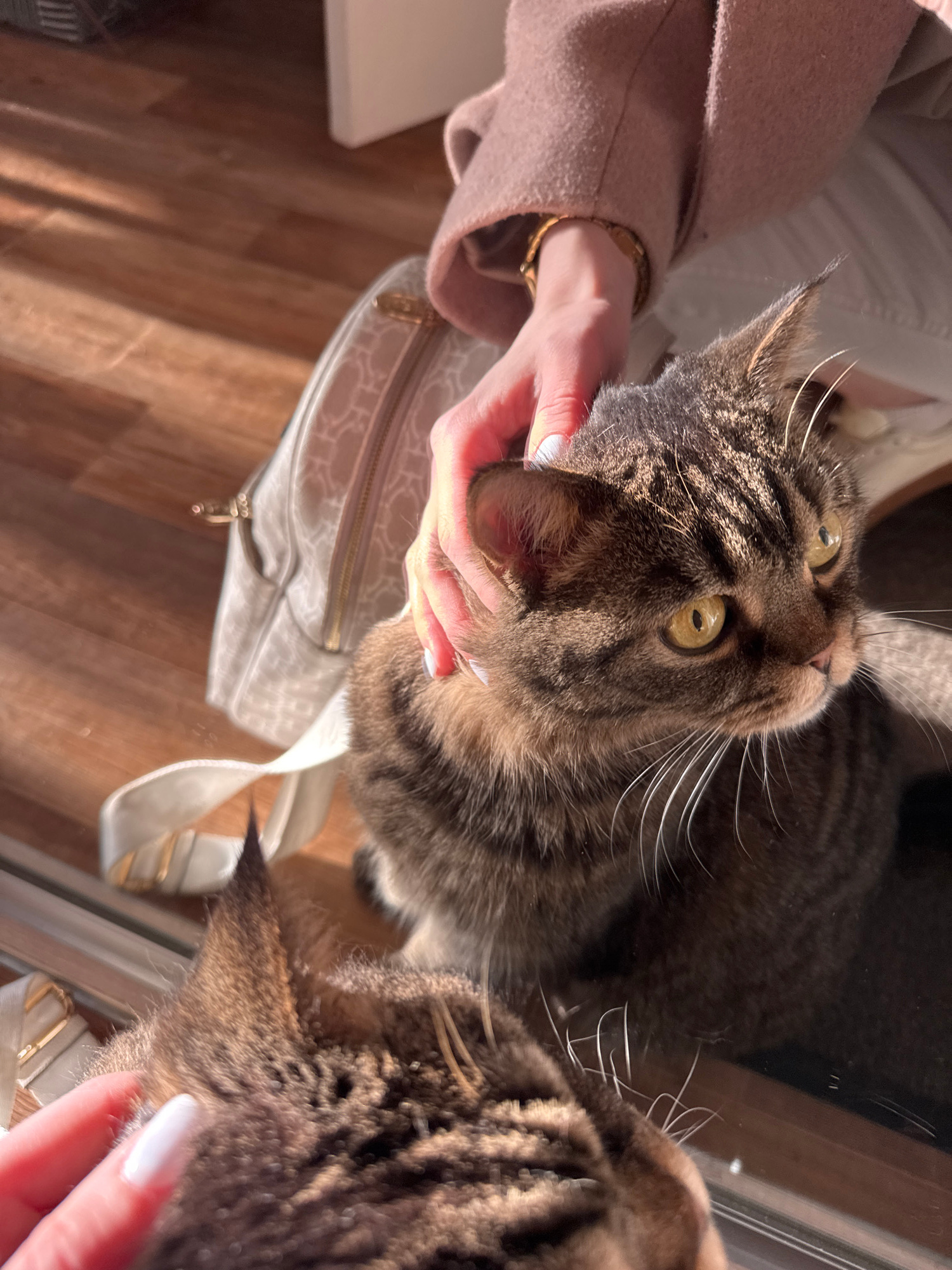 A tabby cat with green eyes is being petted by a person with manicured nails and a gold bracelet. The cat is near a light-colored purse on a wood floor. The cat's reflection is visible in what appears…read more