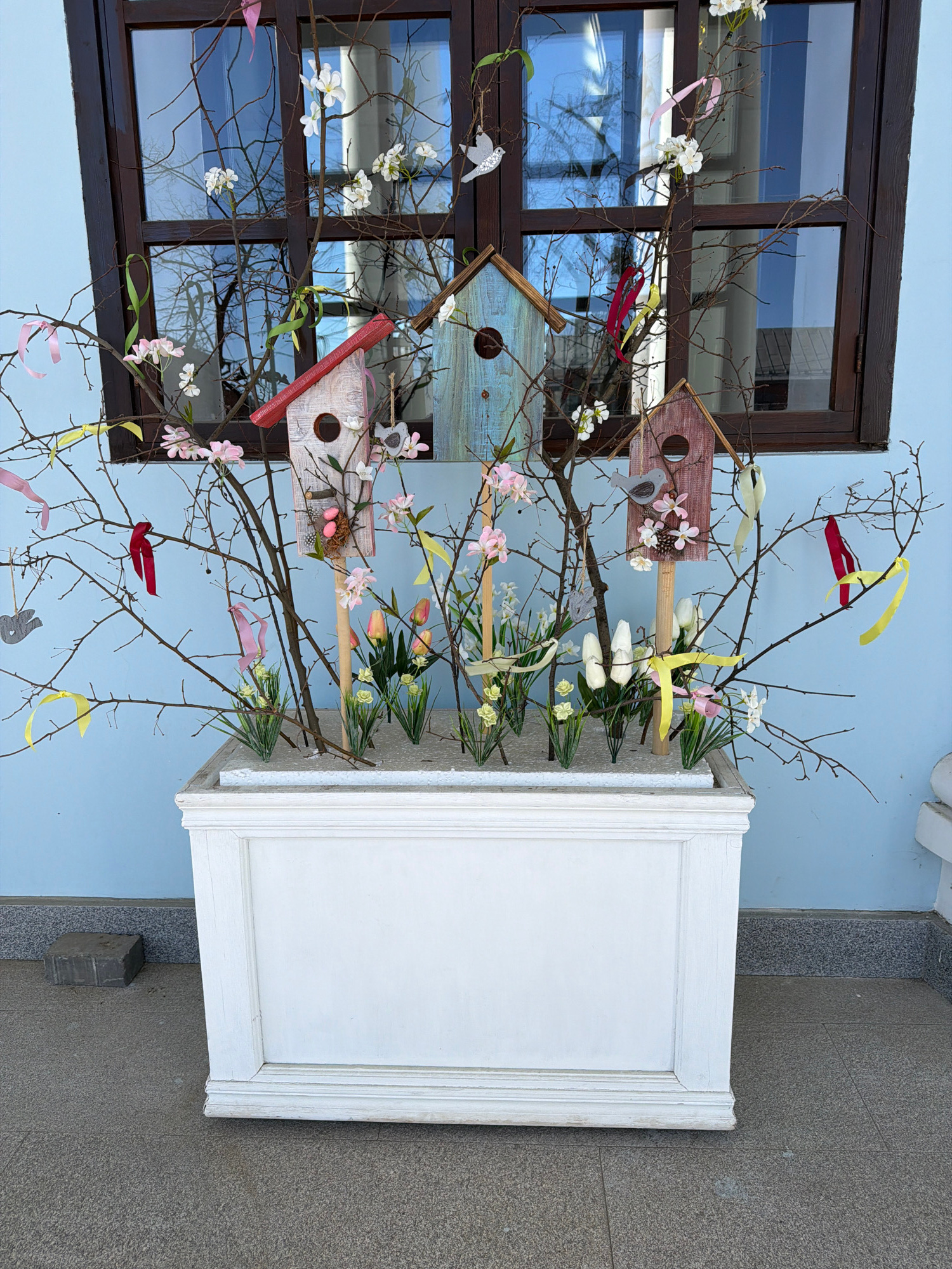 The image depicts a springtime floral arrangement in Votkinsk, Russia. The arrangement is housed in a white, rectangular planter box and consists of bare branches decorated with faux flowers, colorful…read more