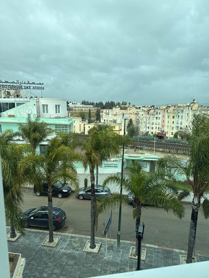 This image captures an urban scene in Meknes, Morocco, specifically overlooking the Polyclinique Dar Asseha area. The view is from an elevated vantage point, possibly a window, under a uniformly overc…read more
