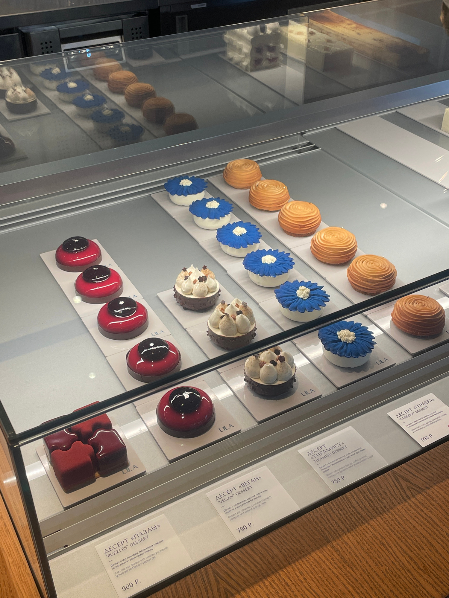 Here is a description of the image: **Scene:** A display case in a likely upscale pastry shop, possibly in Moscow, Russia, showcasing a variety of individual desserts. The case is refrigerated, as ev…read more