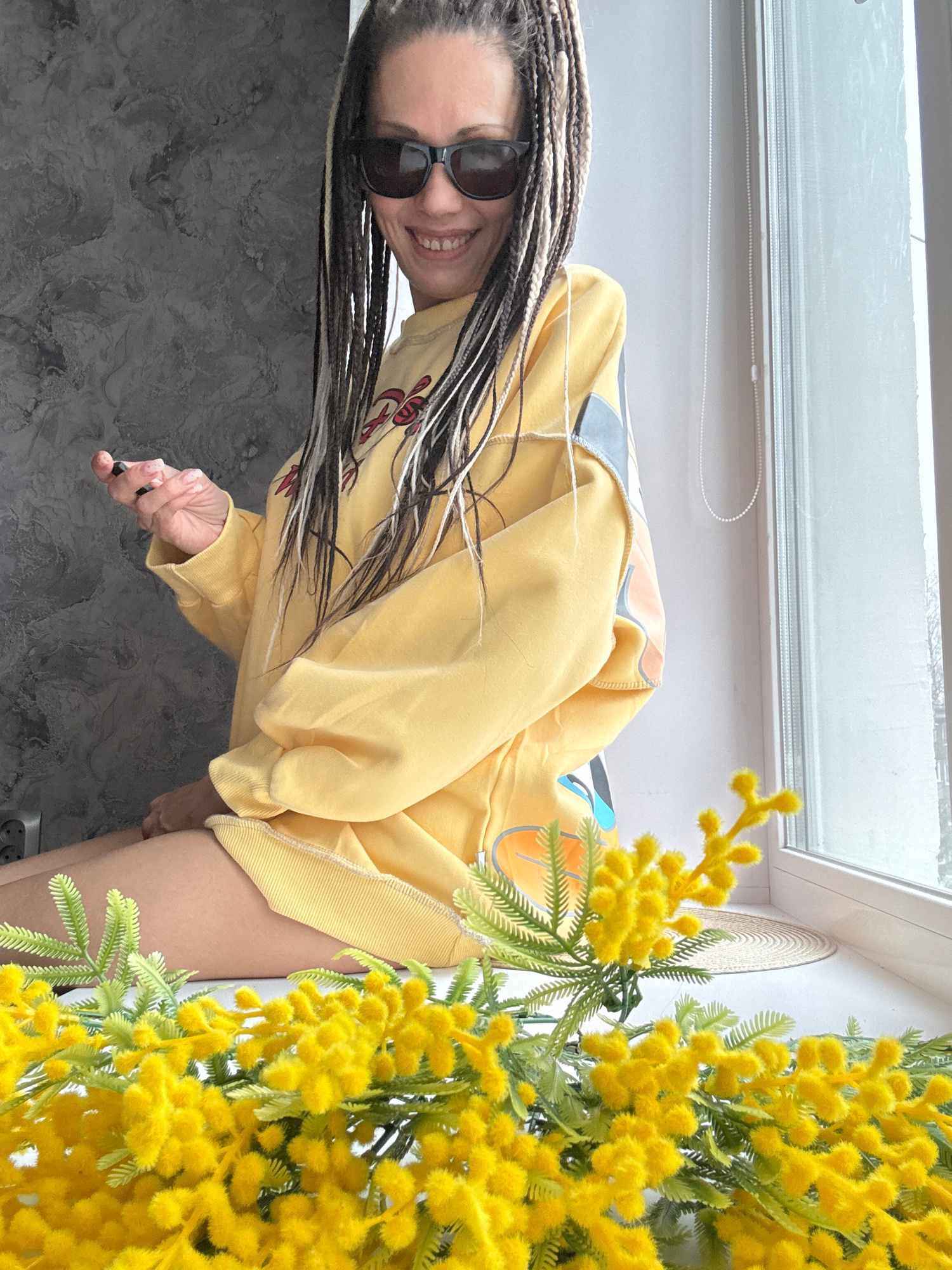 A woman wearing sunglasses and a yellow sweatshirt stands inside, next to a window covered by a white blind. She is holding a small, dark object in her hand. The surface beneath her is gray and marbleβ¦read more
