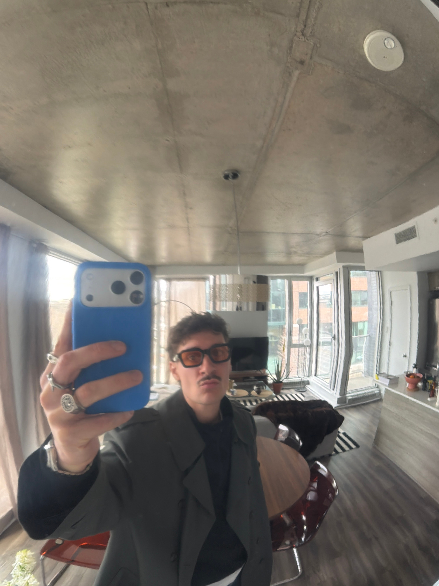 A selfie taken in Montreal, Canada is captured in this off-kilter shot. The person in the selfie holds a blue smartphone, their hand adorned with multiple rings. They wear dark-framed glasses and a da…read more