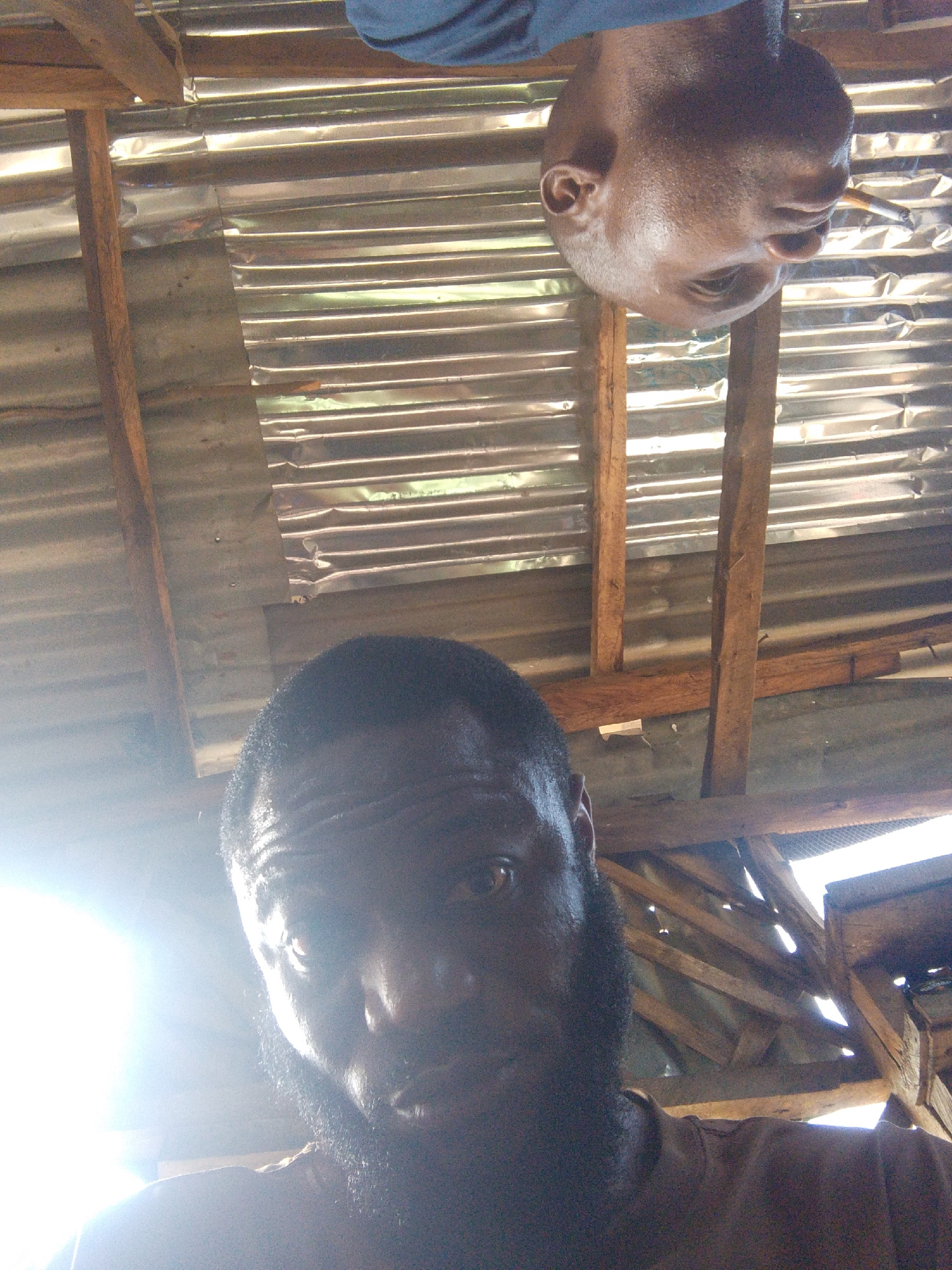 The image shows two men under a corrugated metal roof supported by wooden beams. One man, with a shaved head, is upside down and has a lit cigarette in his mouth. The other man, with a beard, is facin…read more