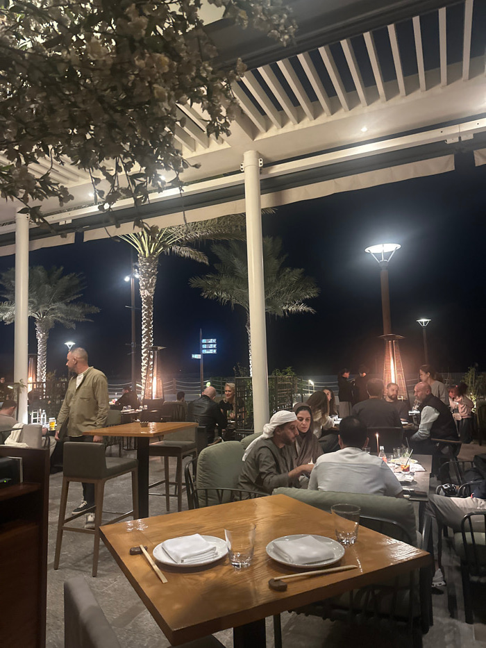 An outdoor restaurant scene at night. Guests are seated at wooden tables with plates and chopsticks. Some individuals wear traditional Middle Eastern attire. Palm trees and streetlights are visible in…read more